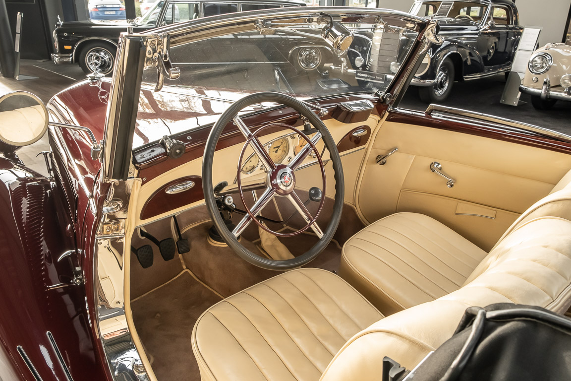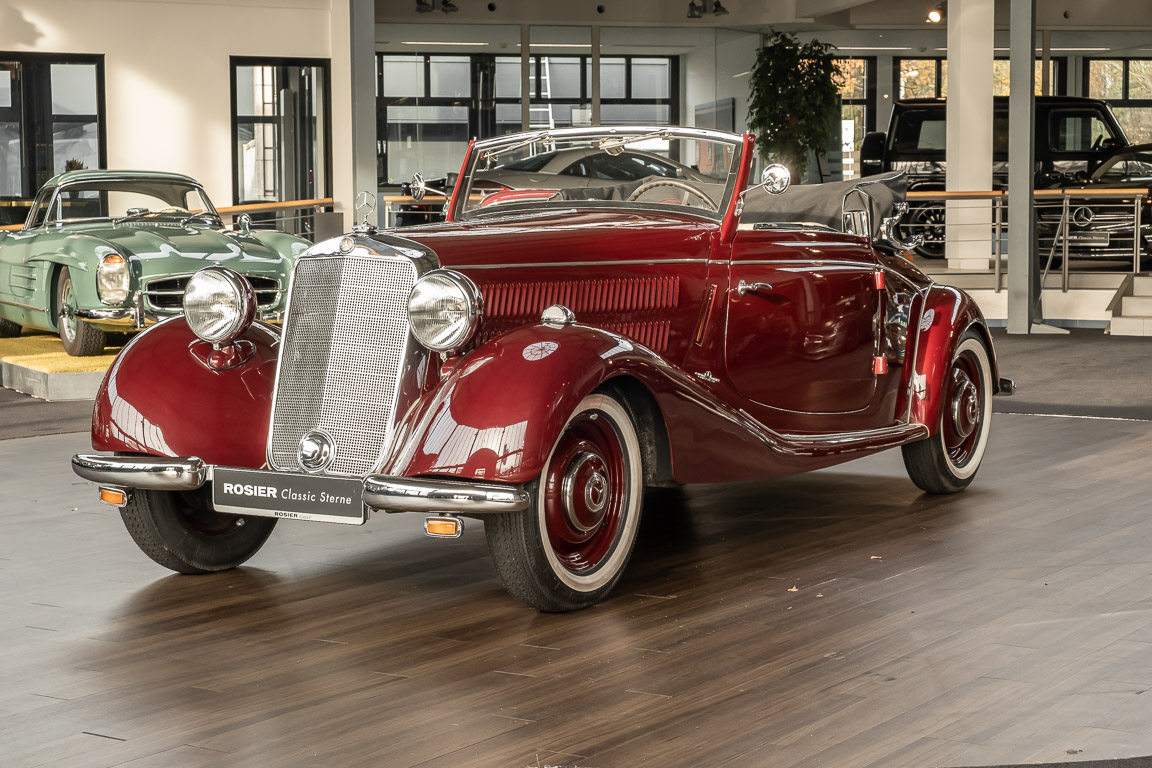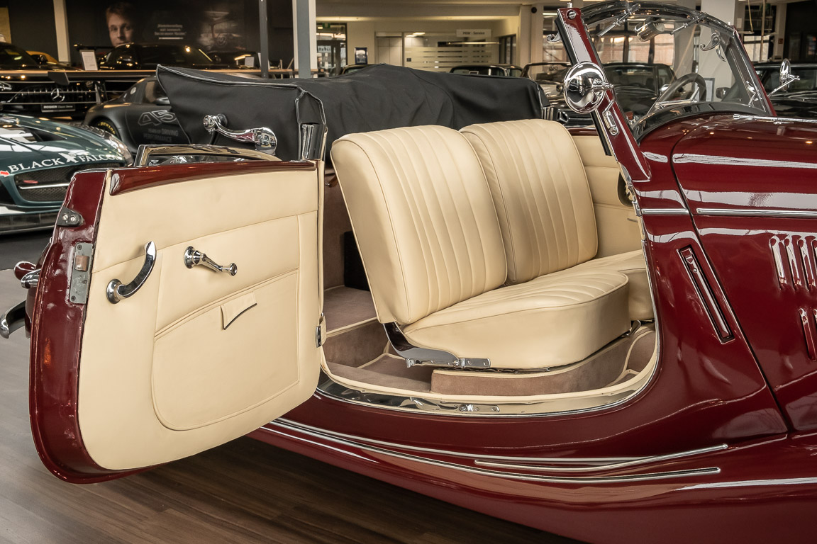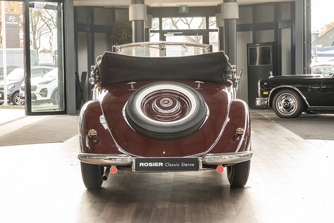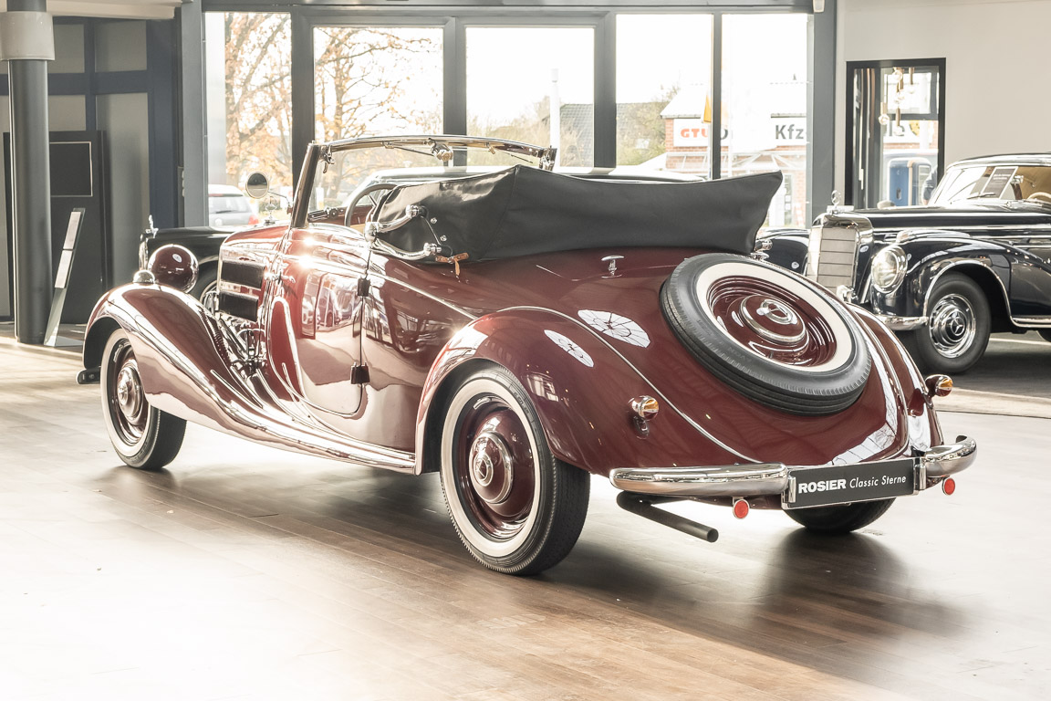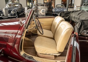 Ein Cabrio Traum mit super Historie ist dieses Mercedes-Benz 170V Cabriolet A aus dem Jahre 1938. Der Wagen wurde im Oktober 1938 über das bis heute bestehende Autohaus Metje + Ziegler in Windhoek, Namibia, an Jürgen Voigts in Voigtsgrund im Bezirk Gibeon, ausgeliefert. Die Farm der angesehenen, deutschstämmigen Familie Voigts, umfasste zu dieser Zeit bereits 160.000 Hektar meist Eigenland und war bekannt für seine etwa 17.000 Tiere umfassenden Karakulschaf-Herden. Die Kriegsjahre verblieb der Wagen in Namibia und kam erst nach dem Krieg zurück nach Deutschland. Er fand seine Heimat im Raum München und gehörte Mitte der 1960er Jahre unter anderem dem Schauspieler Danilo Zschauer aus München, wie man dem noch original vorhandenen Pappbrief entnehmen kann. Am 25.08.1978 kam das Cabrio gemäß dem uns vorliegenden originalen Kaufvertrag in den Besitz eines höchst erfolgreichen Unternehmers im Märkischen Kreis, in Nordrhein-Westfalen. Er pflegte und erhielt den Wagen bestens, entschied sich aber einer Mitte der 1980er Jahre zu einer Totalrestaurierung. Die Restaurierung war von solcher Güte, dass sich der Wagen auch heute, viele Jahre später, in nahezu makellosem Zustand präsentiert. Er lädt ein zu stilvollen Ausfahrten mit unendlich schönem Cabrio-Vergnügen durch malerische Landschaften.