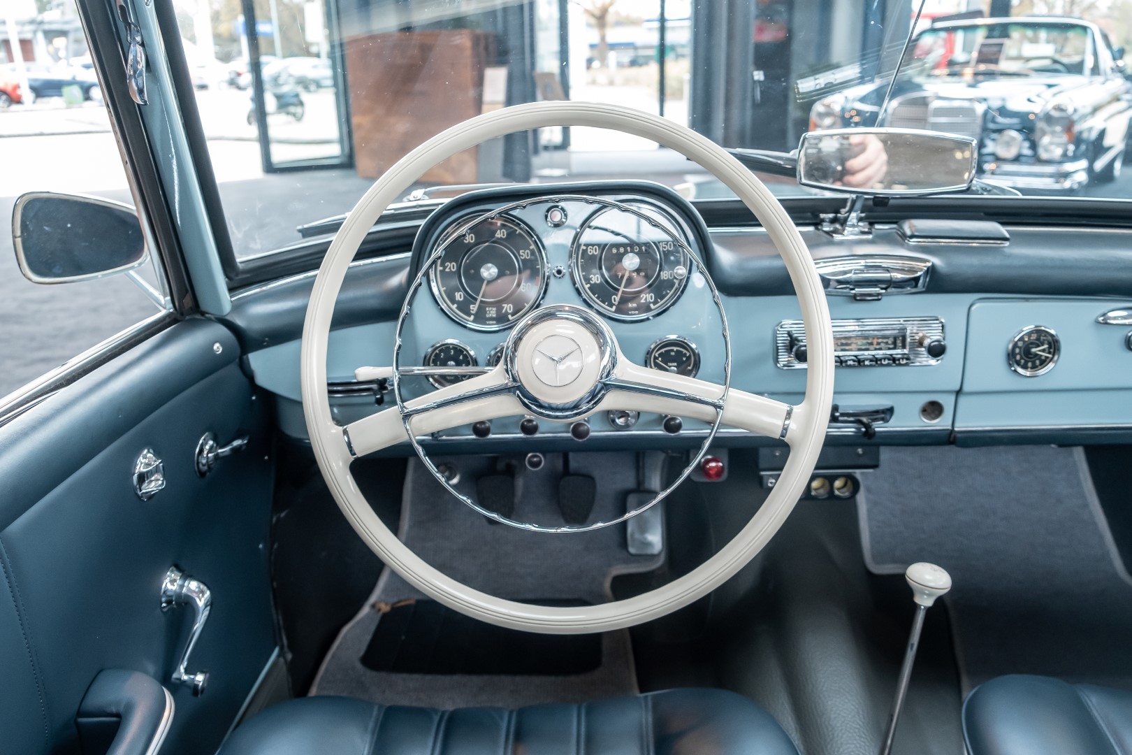 Dieser traumhafte 190 SL der Baureihe W121 wurde im Jahre 1962 fertiggestellt und gelang anschließend ins sonnige Kalifornien. Über 40 Jahre verblieb das Fahrzeug im Sonnenstaat bis das Fahrzeug im Jahre 1997 zurück nach Deutschland gelang. Durch das trockenwarme Klima war die Basis für die Restauration ideal. Bei einem renommierten Fachbetrieb wurde die Restauration von Grund auf und mit einem besonderen Maß an Qualität durchgeführt. Das Ergebnis beeindruckt: ein tadelloser Motorlauf, beste Fahreigenschaften und ein traumhaftes optisches Erscheinungsbild – vom Lackkleid über die Lederausstattung bis hin zum Stoffverdeck. Ein Mercedes-Enthusiast fand Gefallen an dem klassischen Roadster und verliebte sich spontan in die seltene Farbkombination Horizontblau mit dunkelblauem Leder und Verdeck-Stoff. Platzmangel ist der Grund dafür, dass wir Ihnen dieses Fahrzeug aus dessen erlesener Sammlung nun anbieten dürfen. Erleben Sie diesen Ausnahme 190er. Die nächsten Sonnentage kommen bestimmt.