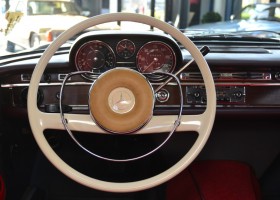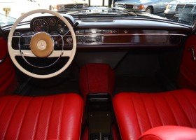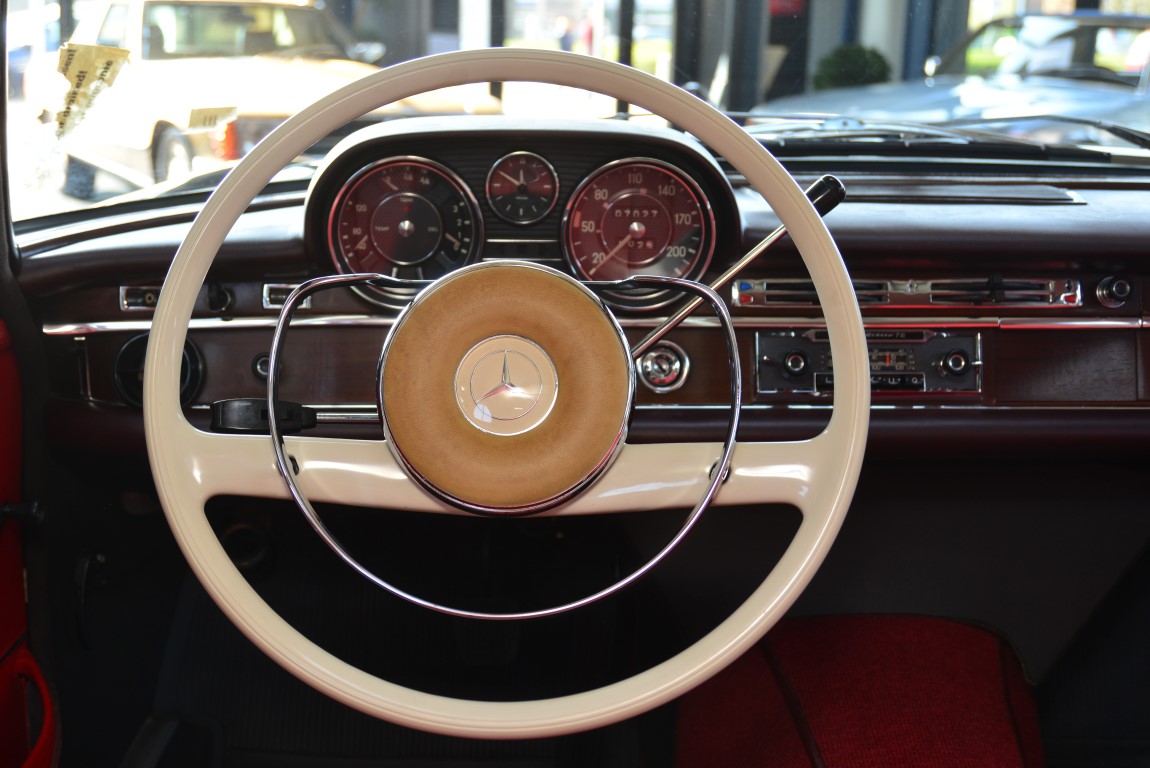 Im Oktober 2018 wurde ein Mercedes-Liebhaber aus Spanien auf den Wagen aufmerksam. Er hatte ihn entdeckt in einer trockenen Scheune gelegen, in einer 75 Seelen-Gemeinde der Provinz Soria. Der Wagen war staubig, die Scheune gut belüftet, das Klima dort trocken. Ein schwarzer Mercedes-Benz 250SE mit hellrotem Leder stand dort gut geschützt. Bei näherem Betrachten stellte sich heraus, dass der Wagen in bester Substanz, ohne jeglichen Rost, wohl lange Zeit hier verbracht hat. Ein paar leichte Dellen und kleinere Kratzer aus über 50 Jahren musste er wohl hinnehmen. Beim Öffnen der Türen kam ein absolut neuwertiges rotes Leder zum Vorschein, das aussah, als ob noch nie jemand darauf gesessen hatte. An den Innenseiten der Türen waren noch die Schutzfolien vom Werk. Ein Blick auf den Tachometer ließ den Atem stocken. Erst 7.022 Kilometer auf der 5-stelligen Anzeige und keinerlei Abnutzungen. Sensationell ! Das Profil der Reifen war neuwertig, eine Kontrolle des Fertigungsdatums ergab, dass es die ersten Reifen sein müssen, aus 1966.