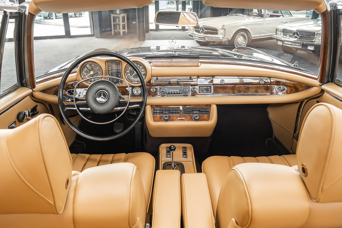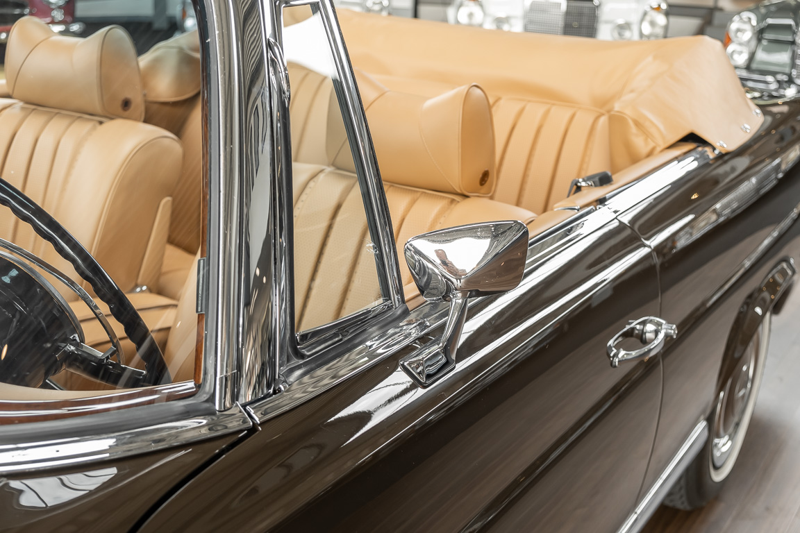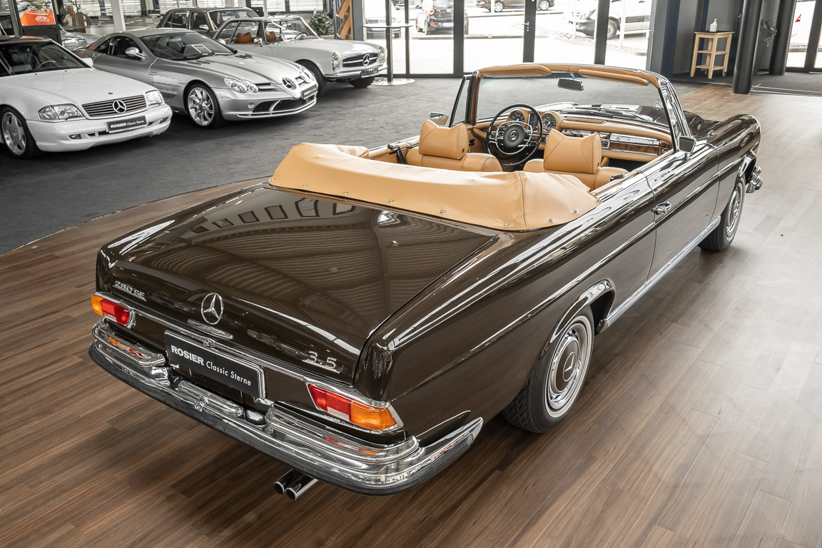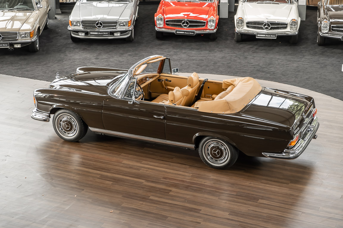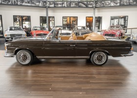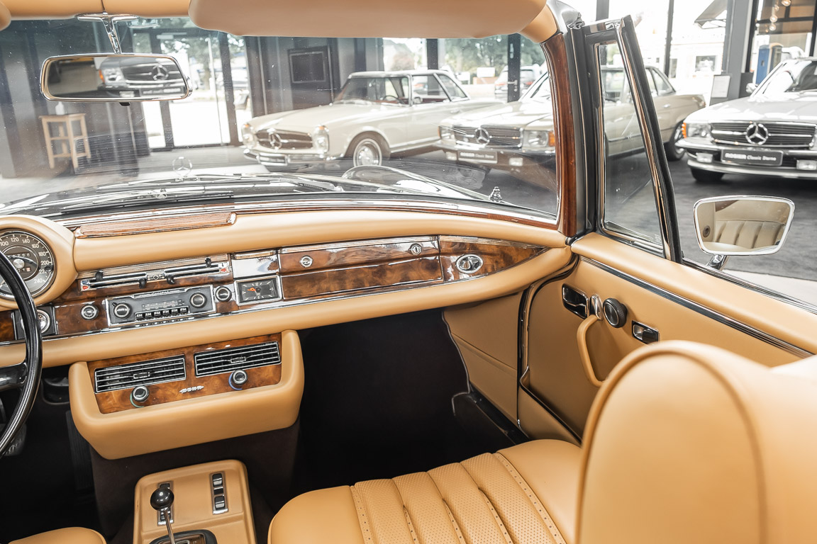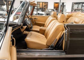 Dieses elegante 280SE 3.5 Liter Cabriolet wurde im Frühjahr 1971 bei Mercedes-Benz in Deutschland fertiggestellt und nach South Carolina/USA verschifft. Die Ausstattung war exzellent und umfasste ein Becker Radio, Klimaanlage aus dem Hause BEHR und Automatik Getriebe mit Mittelschaltung. Der Erstbesitzer hatte den Wagen in elegantem Tabakbraun in Verbindung mit cognacfarbenem Lederinterieur geordert, das mit der dunkelbraunen Wurzelholzausführung des Armaturenbretts besonders harmoniert. Das elegante Cabriolet blieb lange Jahre in South Carolina und fand in 2012 seinen Weg nach Georgia/USA. Von dort kam der Wagen in 2014 nach Deutschland und wurde über die Mercedes-Benz Niederlassung in Hannover an seinen bisherigen Besitzer verkauft. Der Wagen wurde sorgfältig überarbeitet und erhielt in diesem Zug eine neue Lederausstattung in feinster Qualität. Sie unterstreicht eindrucksvoll die schier unendliche Eleganz dieses 280 SE 3.5 Liter Cabriolets. Machen Sie sich am besten selbst ein Bild in unseren Räumlichkeiten, Sie werden begeistert sein.