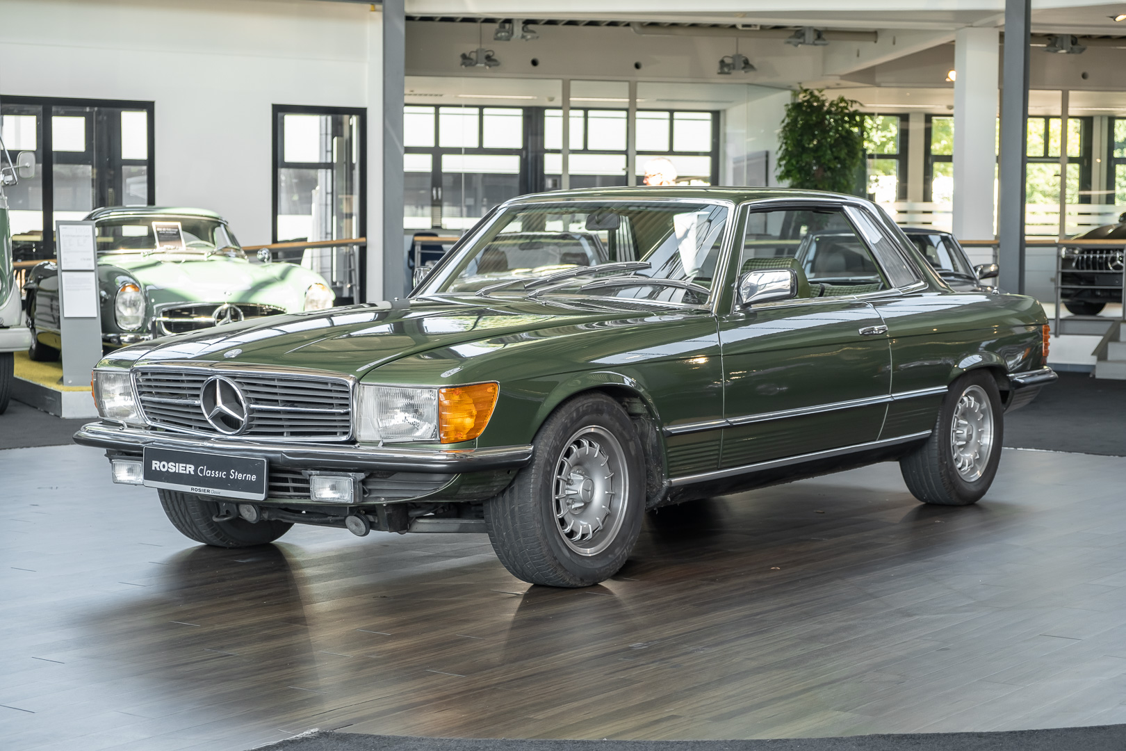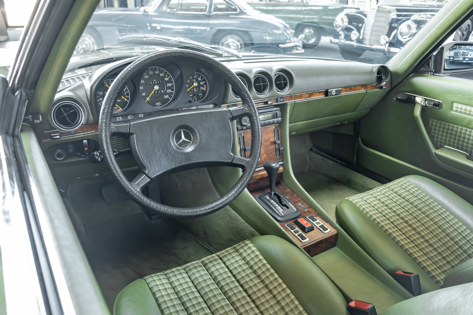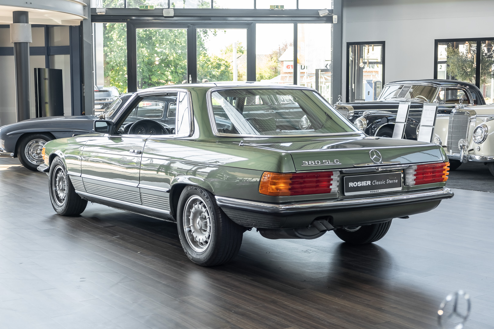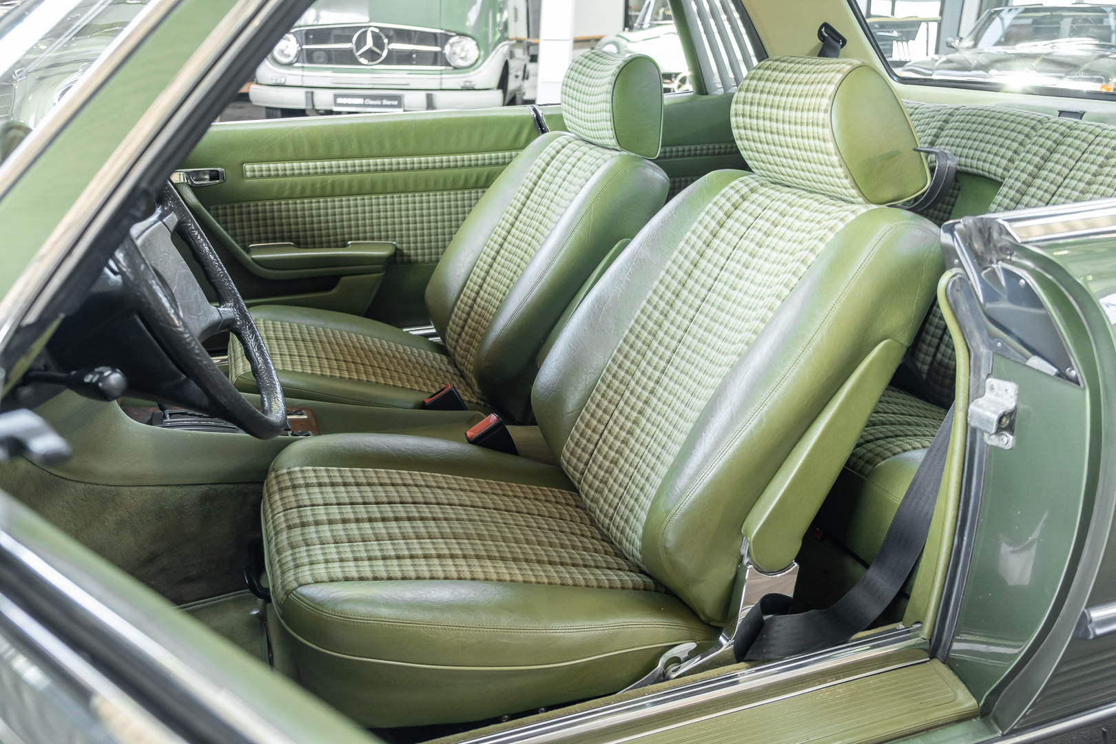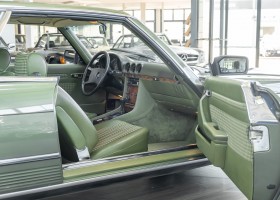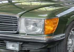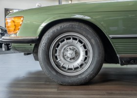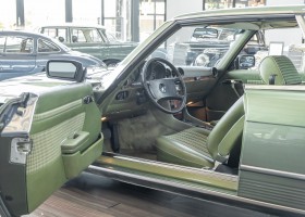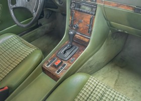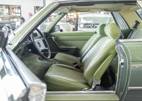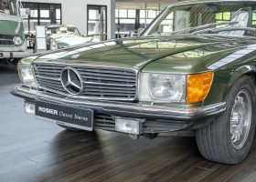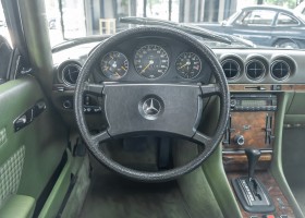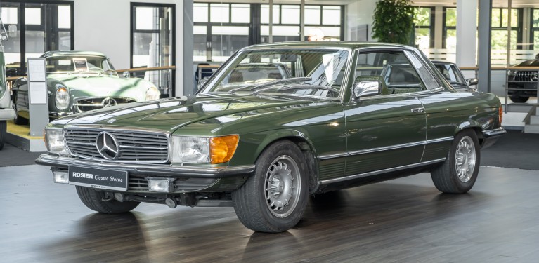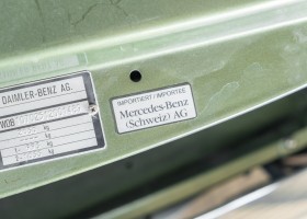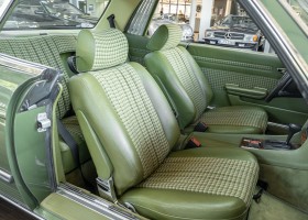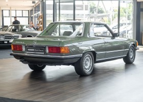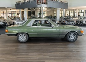 Ein automobiler Traum in Zypressengrün-metallic und der heute so gesuchten Stoff Karo Innenausstattung, passend in Olive, ist dieser Mercedes-Benz 380SLC aus der C107 Serie. Der Inhaber einer Rohrbiegerei im Schweizer Waengi, hatte sich in der Kreuzgarage Meggli in Elgg, seinen persönlichen Wunschtraum verwirklicht. Ein Mercedes-Benz Coupé mit kräftigem 8 Zylinder Motor, in seiner Lieblingsfarbe. Der Wagen bereitete ihm großen Fahrspaß. Er ließ jeden Kundendienst ausführen und jede Kleinigkeit sofort in Ordnung bringen. Es ist eine Freude das sorgfältig ausgefüllte Original Kundendienstscheckheft mit allen seinen Stempeln und Eintragungen zu lesen. Der Wagen blieb etwa 12 Jahre in der Schweiz. Im Mai 2013 kam das Coupé in eine zarte Damenhand im benachbarten Baden-Württemberg in Deutschland. Sein Weg führte es weiter über einen Besitzer in Schleswig-Holstein nach Braunschweig in Niedersachsen. Im Jahre 2017 konnten wir das Fahrzeug in eine Berliner Autosammlung verkaufen, aus dessen Besitz wir das Fahrzeug nun wieder anbieten düren. Der Pflegezustand des Wagens ist noch immer einmalig. Man sieht förmlich, dass er stets pfleglich behandelt und gewartet wurde. Die hohe Qualität der Lackierung zeigt, dass in jüngerer Zeit einmal eine fachmännische Überarbeitung stattfand. Die satte Farbe und der Tiefenglanz lassen das Coupé funkeln. Die Innenausstattung und die Technik zeigen sich von ihrer besten Seite. Eine Rarität, wie sie kaum zu finden ist. Es wurden nur 3.789 Fahrzeuge des 380 SLC gebaut, was ihn auch zu einem interessanten Sammlerobjekt macht.