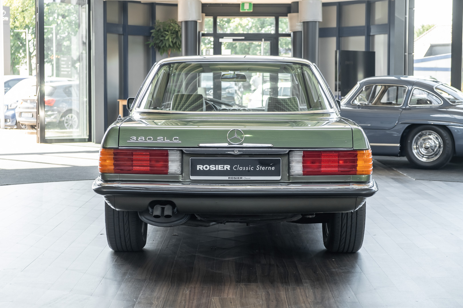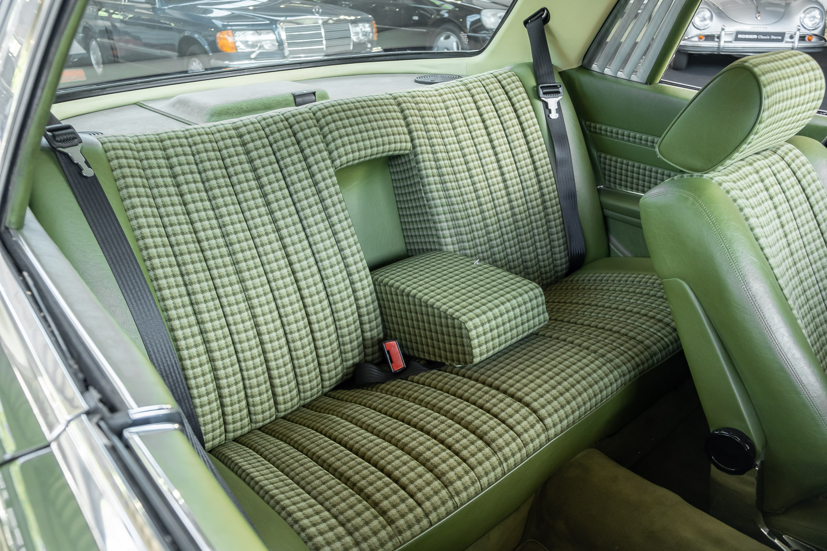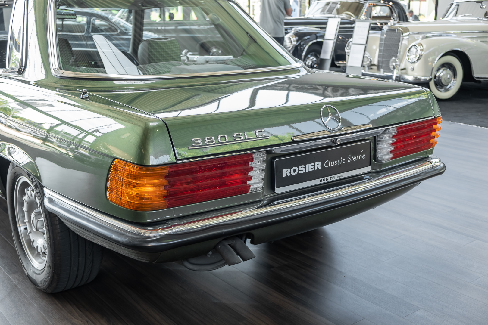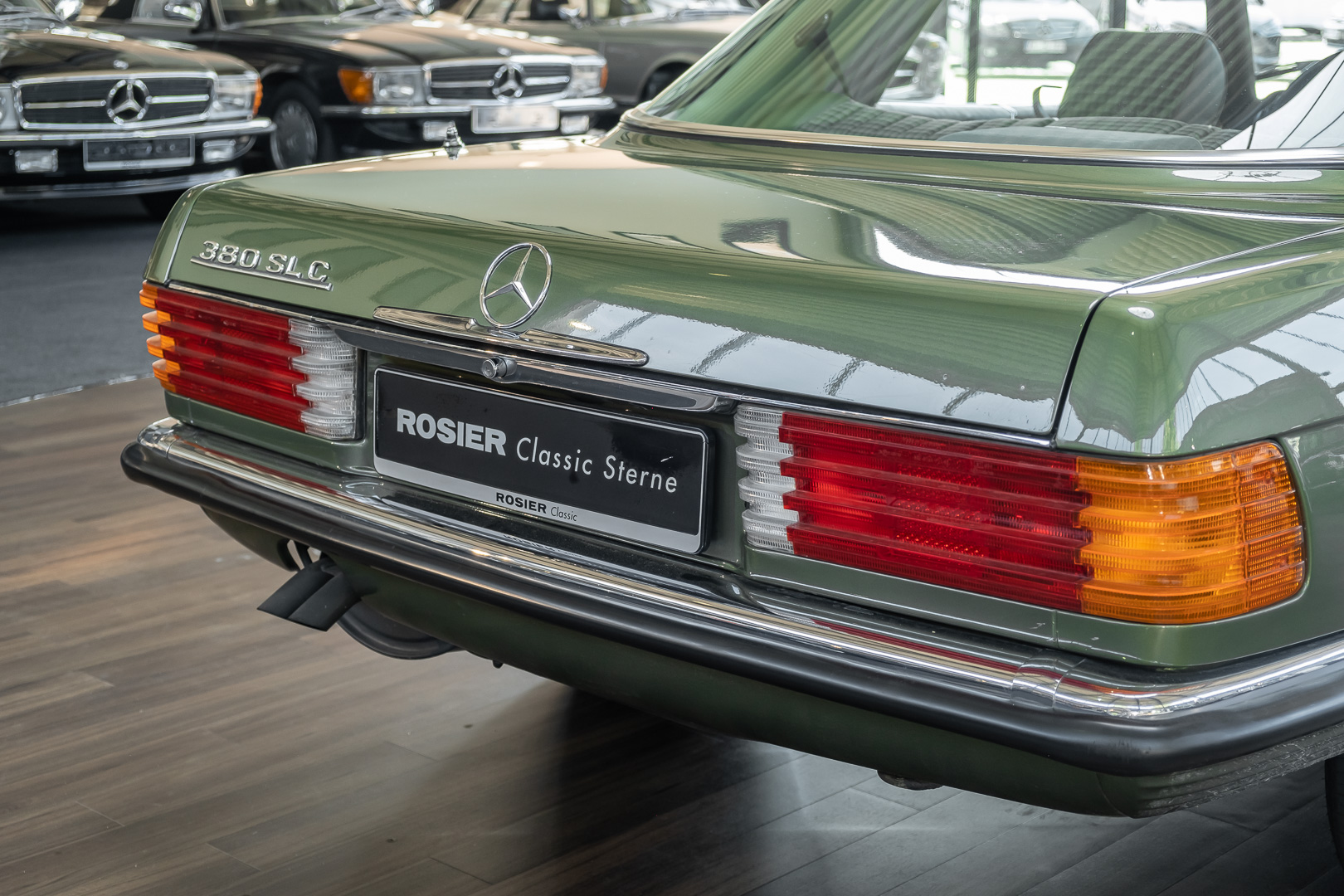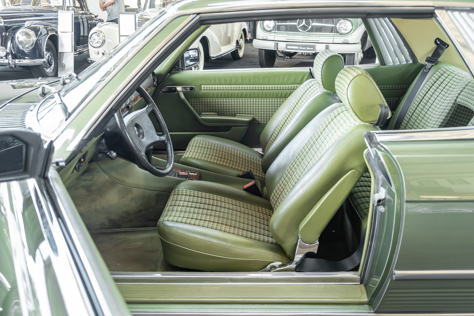 Ein automobiler Traum in Zypressengrün-metallic und der heute so gesuchten Stoff Karo Innenausstattung, passend in Olive, ist dieser Mercedes-Benz 380SLC aus der C107 Serie. Der Inhaber einer Rohrbiegerei im Schweizer Waengi, hatte sich in der Kreuzgarage Meggli in Elgg, seinen persönlichen Wunschtraum verwirklicht. Ein Mercedes-Benz Coupé mit kräftigem 8 Zylinder Motor, in seiner Lieblingsfarbe. Der Wagen bereitete ihm großen Fahrspaß. Er ließ jeden Kundendienst ausführen und jede Kleinigkeit sofort in Ordnung bringen. Es ist eine Freude das sorgfältig ausgefüllte Original Kundendienstscheckheft mit allen seinen Stempeln und Eintragungen zu lesen. Der Wagen blieb etwa 12 Jahre in der Schweiz. Im Mai 2013 kam das Coupé in eine zarte Damenhand im benachbarten Baden-Württemberg in Deutschland. Sein Weg führte es weiter über einen Besitzer in Schleswig-Holstein nach Braunschweig in Niedersachsen. Im Jahre 2017 konnten wir das Fahrzeug in eine Berliner Autosammlung verkaufen, aus dessen Besitz wir das Fahrzeug nun wieder anbieten düren. Der Pflegezustand des Wagens ist noch immer einmalig. Man sieht förmlich, dass er stets pfleglich behandelt und gewartet wurde. Die hohe Qualität der Lackierung zeigt, dass in jüngerer Zeit einmal eine fachmännische Überarbeitung stattfand. Die satte Farbe und der Tiefenglanz lassen das Coupé funkeln. Die Innenausstattung und die Technik zeigen sich von ihrer besten Seite. Eine Rarität, wie sie kaum zu finden ist. Es wurden nur 3.789 Fahrzeuge des 380 SLC gebaut, was ihn auch zu einem interessanten Sammlerobjekt macht.