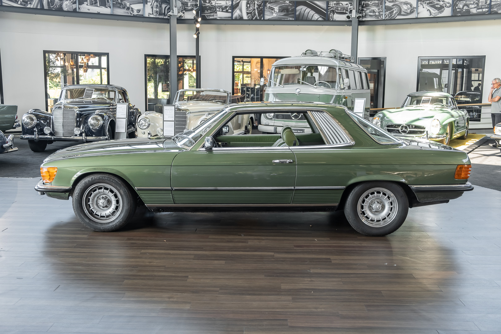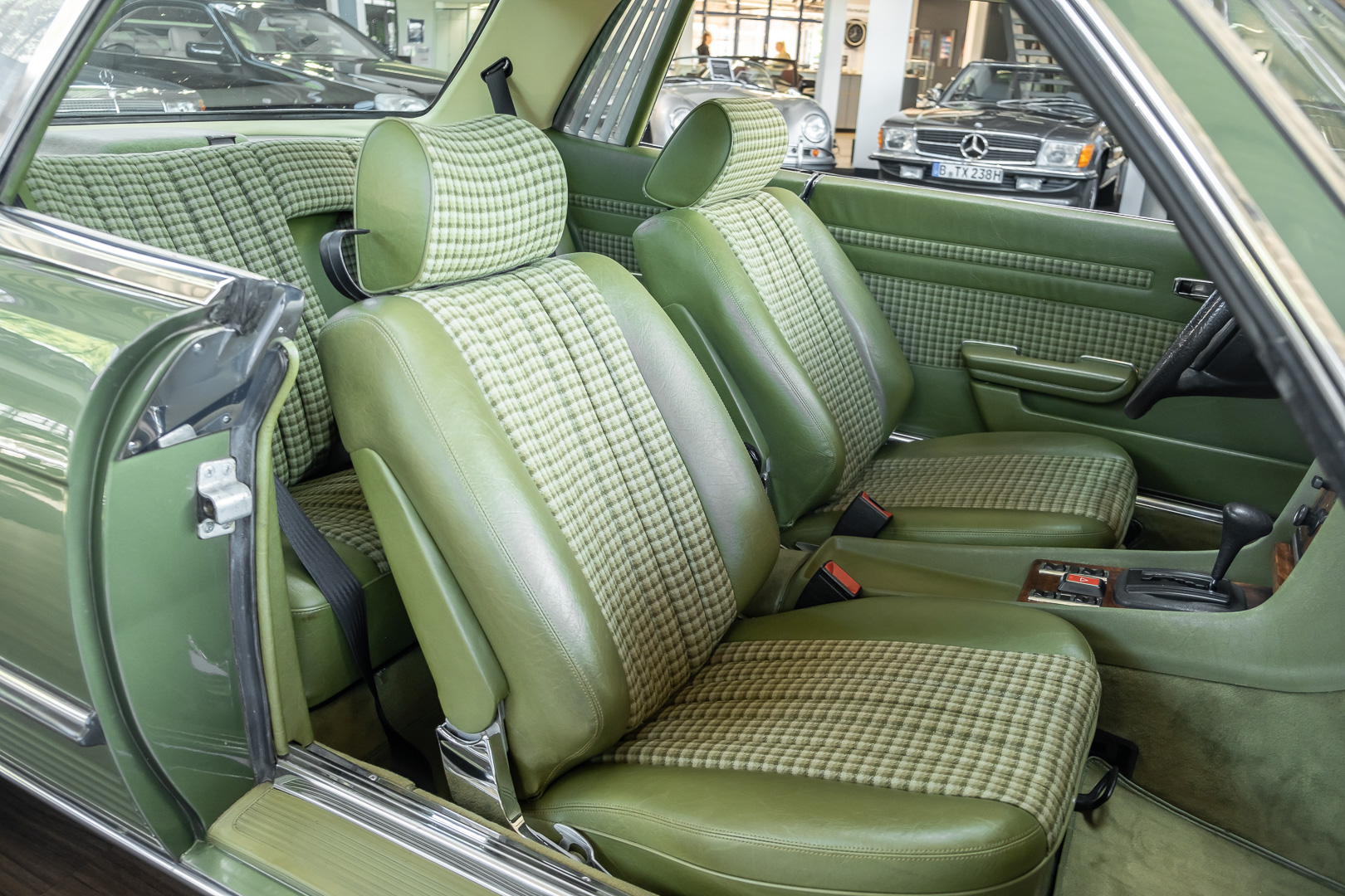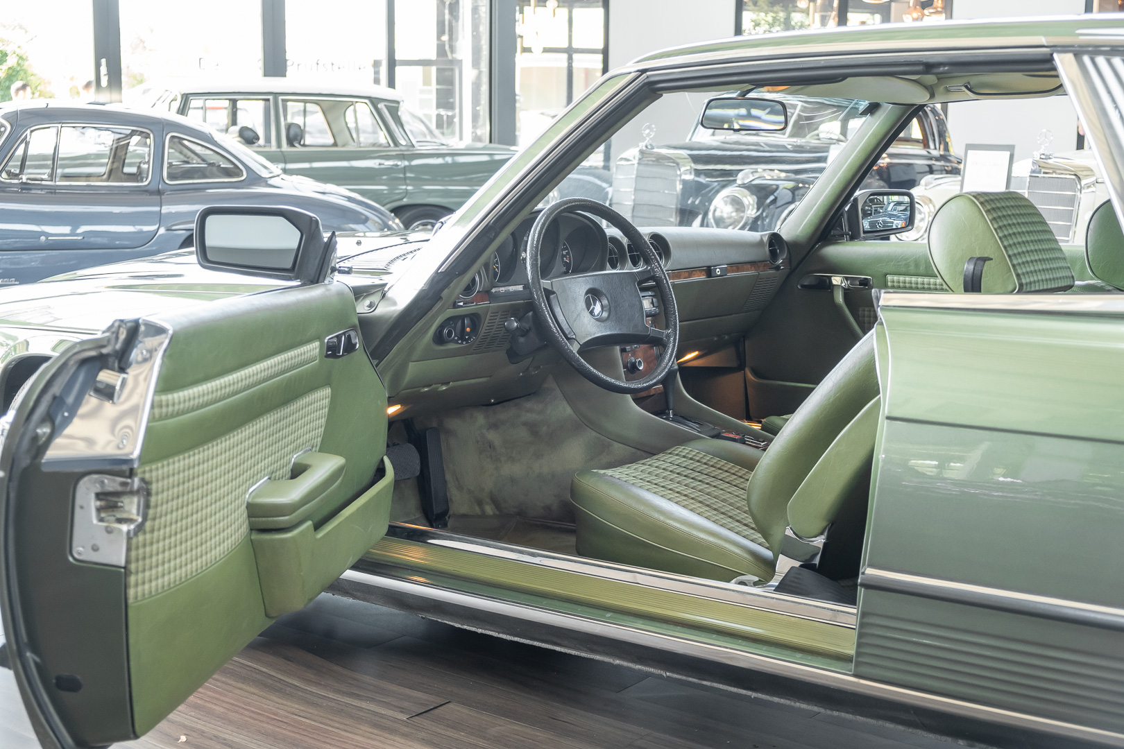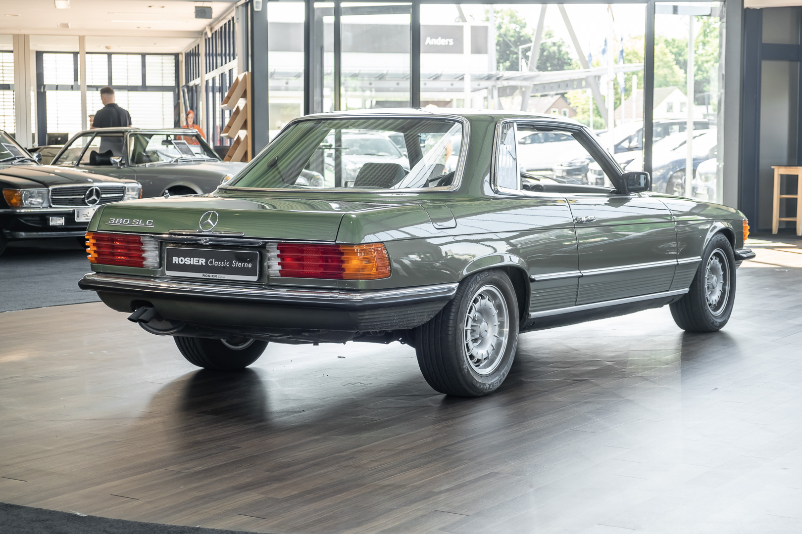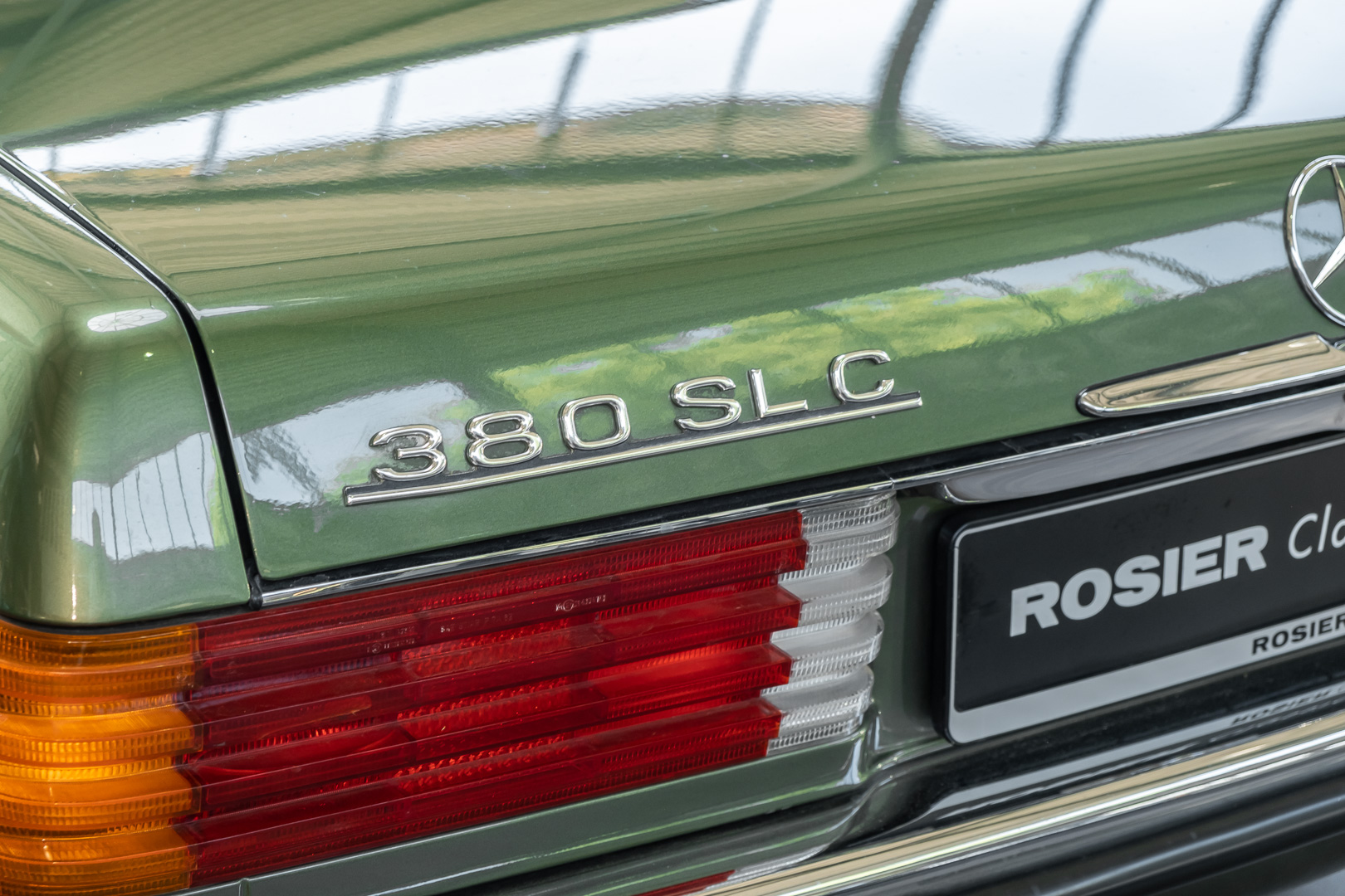 Ein automobiler Traum in Zypressengrün-metallic und der heute so gesuchten Stoff Karo Innenausstattung, passend in Olive, ist dieser Mercedes-Benz 380SLC aus der C107 Serie. Der Inhaber einer Rohrbiegerei im Schweizer Waengi, hatte sich in der Kreuzgarage Meggli in Elgg, seinen persönlichen Wunschtraum verwirklicht. Ein Mercedes-Benz Coupé mit kräftigem 8 Zylinder Motor, in seiner Lieblingsfarbe. Der Wagen bereitete ihm großen Fahrspaß. Er ließ jeden Kundendienst ausführen und jede Kleinigkeit sofort in Ordnung bringen. Es ist eine Freude das sorgfältig ausgefüllte Original Kundendienstscheckheft mit allen seinen Stempeln und Eintragungen zu lesen. Der Wagen blieb etwa 12 Jahre in der Schweiz. Im Mai 2013 kam das Coupé in eine zarte Damenhand im benachbarten Baden-Württemberg in Deutschland. Sein Weg führte es weiter über einen Besitzer in Schleswig-Holstein nach Braunschweig in Niedersachsen. Im Jahre 2017 konnten wir das Fahrzeug in eine Berliner Autosammlung verkaufen, aus dessen Besitz wir das Fahrzeug nun wieder anbieten düren. Der Pflegezustand des Wagens ist noch immer einmalig. Man sieht förmlich, dass er stets pfleglich behandelt und gewartet wurde. Die hohe Qualität der Lackierung zeigt, dass in jüngerer Zeit einmal eine fachmännische Überarbeitung stattfand. Die satte Farbe und der Tiefenglanz lassen das Coupé funkeln. Die Innenausstattung und die Technik zeigen sich von ihrer besten Seite. Eine Rarität, wie sie kaum zu finden ist. Es wurden nur 3.789 Fahrzeuge des 380 SLC gebaut, was ihn auch zu einem interessanten Sammlerobjekt macht.