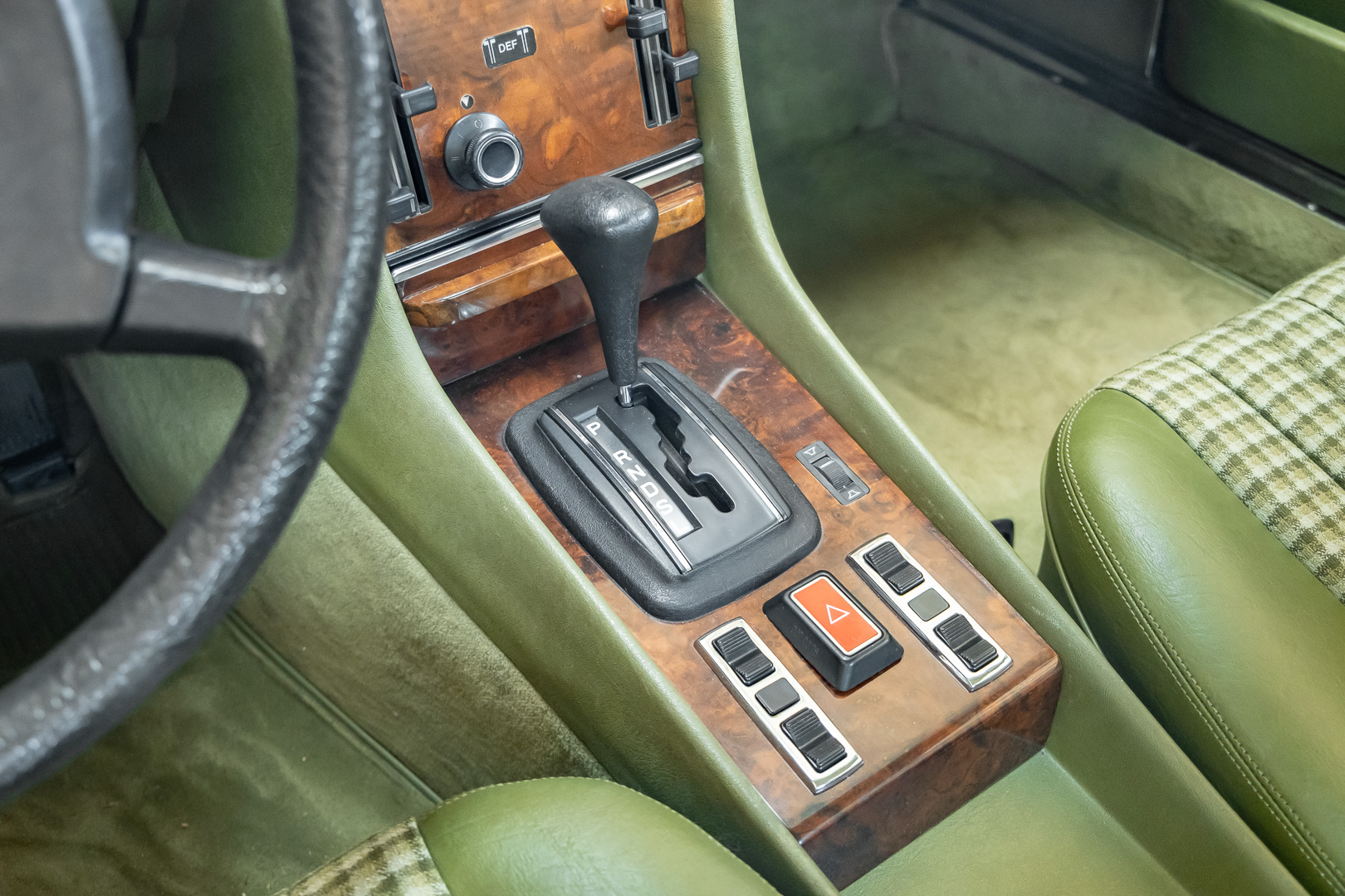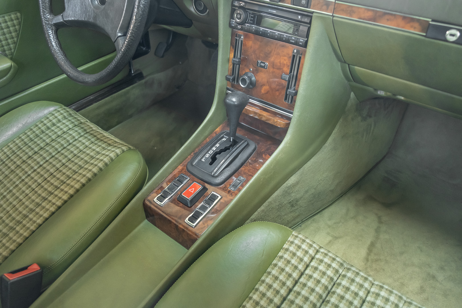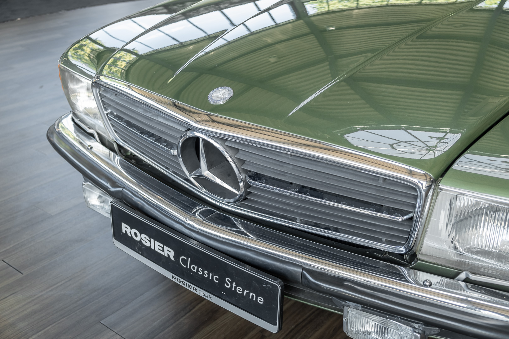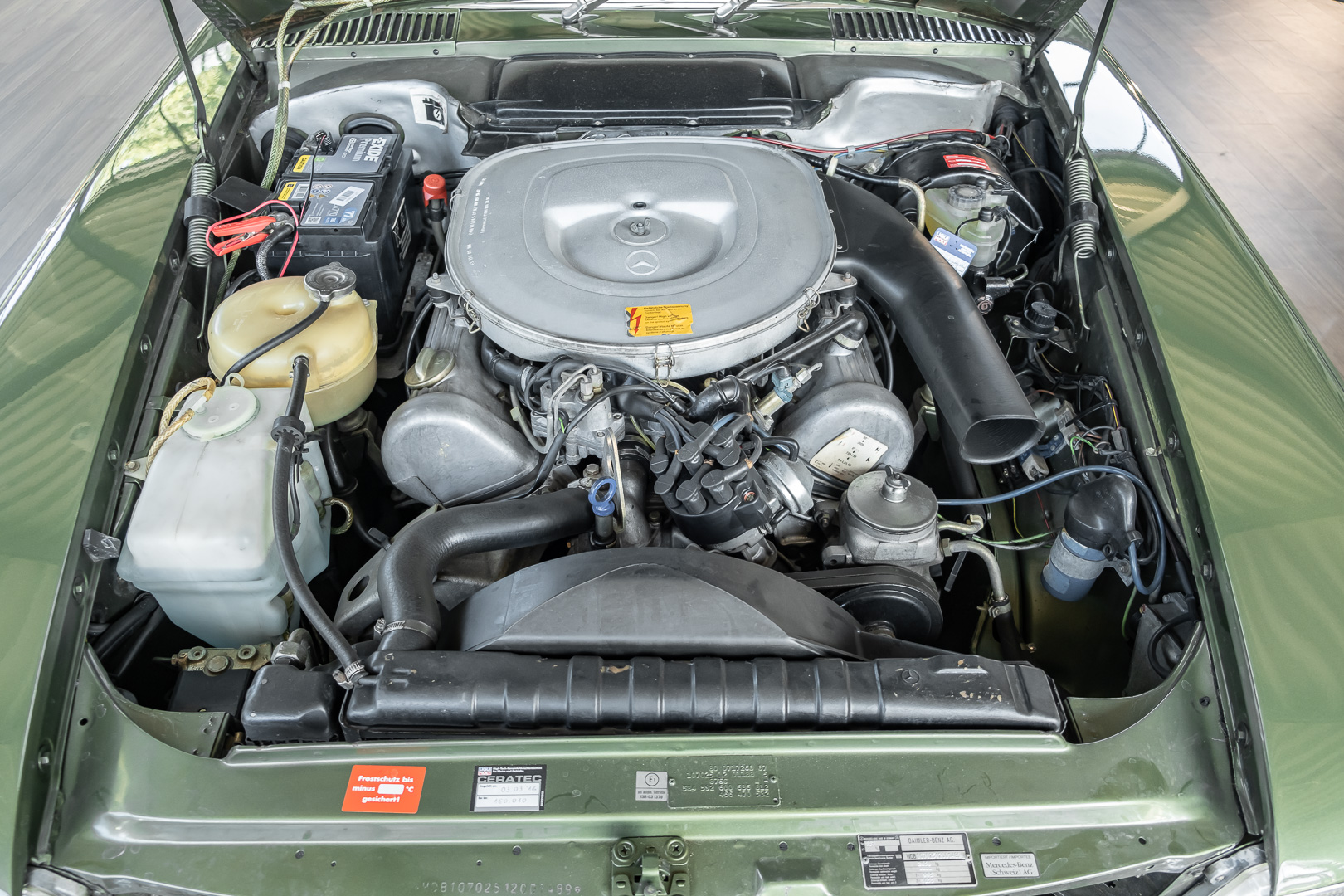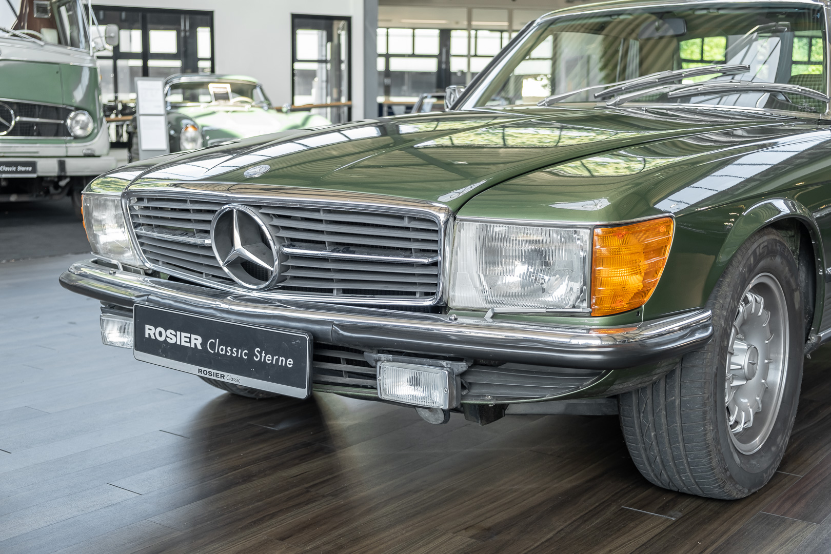 Ein automobiler Traum in Zypressengrün-metallic und der heute so gesuchten Stoff Karo Innenausstattung, passend in Olive, ist dieser Mercedes-Benz 380SLC aus der C107 Serie. Der Inhaber einer Rohrbiegerei im Schweizer Waengi, hatte sich in der Kreuzgarage Meggli in Elgg, seinen persönlichen Wunschtraum verwirklicht. Ein Mercedes-Benz Coupé mit kräftigem 8 Zylinder Motor, in seiner Lieblingsfarbe. Der Wagen bereitete ihm großen Fahrspaß. Er ließ jeden Kundendienst ausführen und jede Kleinigkeit sofort in Ordnung bringen. Es ist eine Freude das sorgfältig ausgefüllte Original Kundendienstscheckheft mit allen seinen Stempeln und Eintragungen zu lesen. Der Wagen blieb etwa 12 Jahre in der Schweiz. Im Mai 2013 kam das Coupé in eine zarte Damenhand im benachbarten Baden-Württemberg in Deutschland. Sein Weg führte es weiter über einen Besitzer in Schleswig-Holstein nach Braunschweig in Niedersachsen. Im Jahre 2017 konnten wir das Fahrzeug in eine Berliner Autosammlung verkaufen, aus dessen Besitz wir das Fahrzeug nun wieder anbieten düren. Der Pflegezustand des Wagens ist noch immer einmalig. Man sieht förmlich, dass er stets pfleglich behandelt und gewartet wurde. Die hohe Qualität der Lackierung zeigt, dass in jüngerer Zeit einmal eine fachmännische Überarbeitung stattfand. Die satte Farbe und der Tiefenglanz lassen das Coupé funkeln. Die Innenausstattung und die Technik zeigen sich von ihrer besten Seite. Eine Rarität, wie sie kaum zu finden ist. Es wurden nur 3.789 Fahrzeuge des 380 SLC gebaut, was ihn auch zu einem interessanten Sammlerobjekt macht.