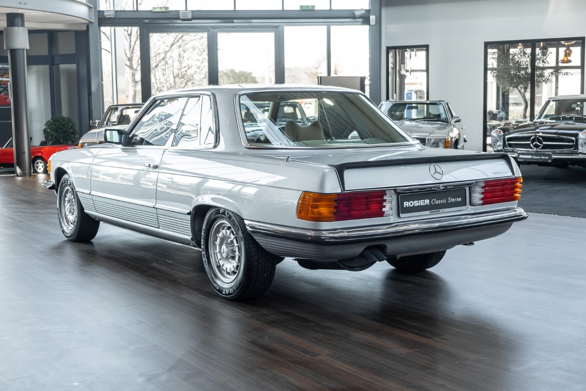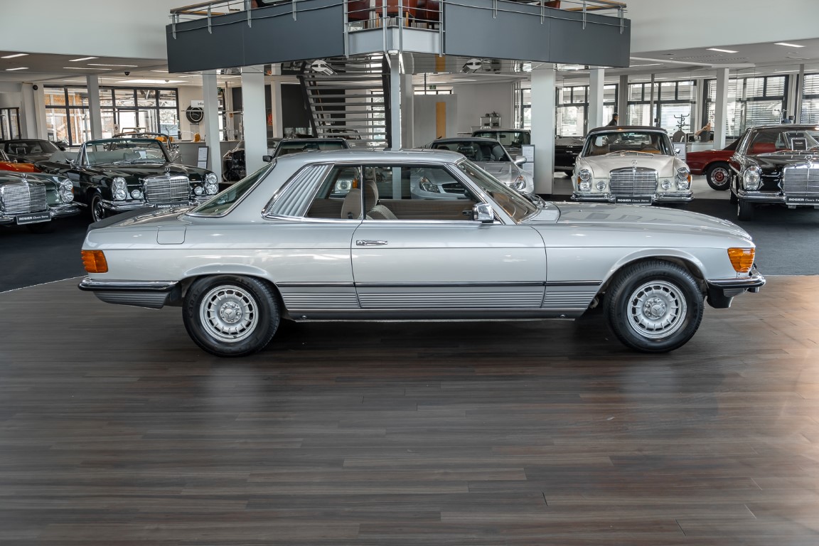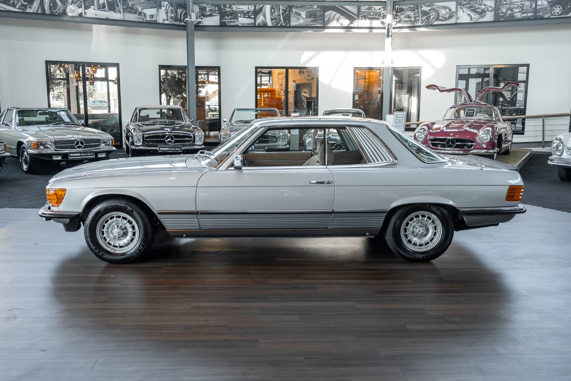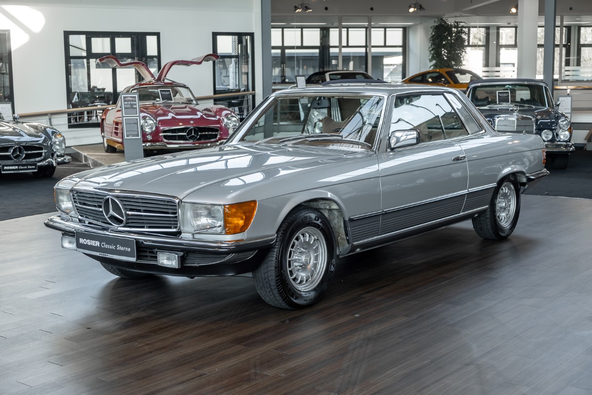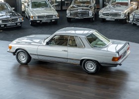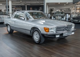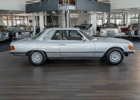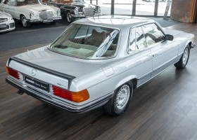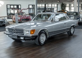 Ein eindrucksvolles Modell mit atemberaubend schöner Linie, sportlich und elegant zugleich, mit schier unendlicher Durchzugskraft. Am 08. März 1979 wurde dieser elegante Mercedes-Benz 450SLC 5.0 auf seinen Erstbesitzer, die Marco Pelz GmbH + Co. KG im Mittelfränkischen Fürth zugelassen. Dort verblieb der Wagen bis 1983. Das immer schwerer gewordene Pelzgeschäft zwang die Firma zum Aufgeben. Das elegante Coupé fand ein neues Zuhause bei einer gut situierten Familie in Regensburg. Hier verblieb der Wagen die nächsten 26 Jahre und wurde lediglich in 1988 von der Frau auf den Mann umgeschrieben. Er wurde wenig gefahren und hatte gemäß TÜV Protokoll aus 1995 eine Kilometerleistung von 125.000 und einem DEKRA Prüfungsbericht aus dem Mai 2009 138.787 km gelaufen. Im Sommer 2009 kam das 450SLC 5.0 Coupé in den Besitz einer Dame in München. Sie pflegte den Wagen und ließ ihn zuerst bei Mercedes-Benz Service und später bei einem auf Mercedes Klassiker spezialisierten Betrieb in München warten. In 2012 verkaufte Sie das Coupé an einen Unternehmer im oberbayrischen Kreis Bad Tölz-Wolfratshausen, etwa 50 km südlich von München. Der neue Besitzer wollte den „Diamant“ neu funkeln lassen und ließ ihn von einem Karosseriefachbetrieb sorgfältig und fachmännisch überarbeiten. In diesem Zug erhielt der Wagen auch eine Ganzlackierung in der Farbe, die er immer hatte, in Astralsilber-metallic. Ordnungsgemäße Rechnungen des Karosseriefachbetriebes und des ansässigen Mercedes-Benz Partners belegen ein Invest von über €uro 16.000,-. Der Gesamtzustand des Wagens ist traumhaft schön. Zuletzt erwarb ein Mercedes-Liebhaber aus Stade das Fahzeug, der es aber kaum nutze. Aus seiner Sammlung dürfen wir Ihnen dieses Traum-Coupé nun anbieten. Die elegante bis heute bestens erhaltene Veloursausstattung, ist fein patiniert und verleiht dem Wagen eine enorme Ausstrahlung. Lassen auch Sie sich in seinen Bann ziehen.