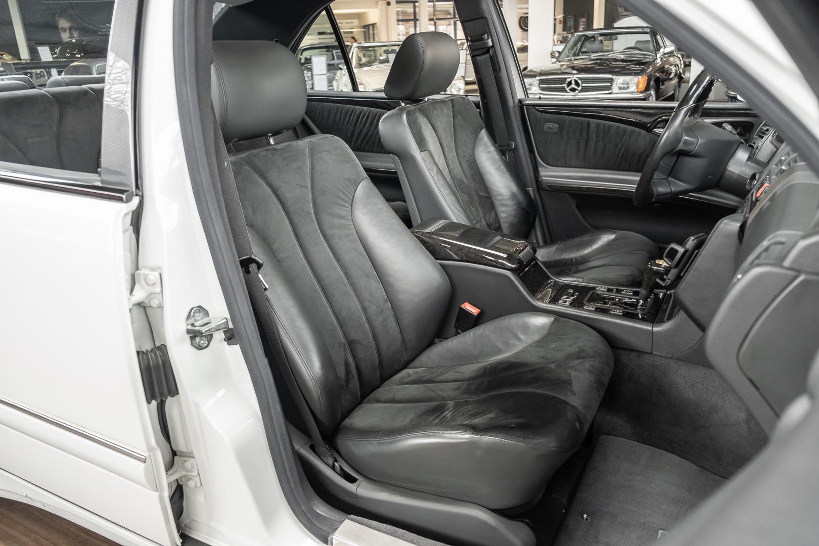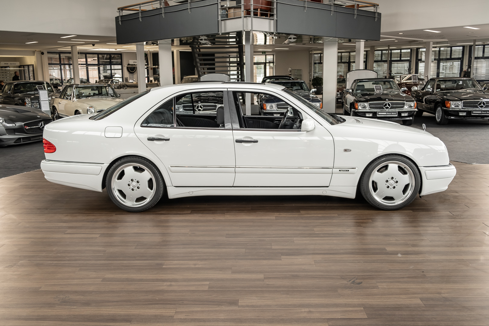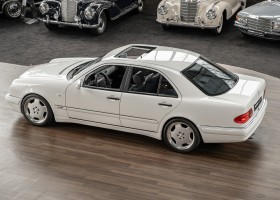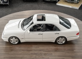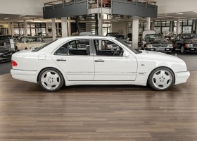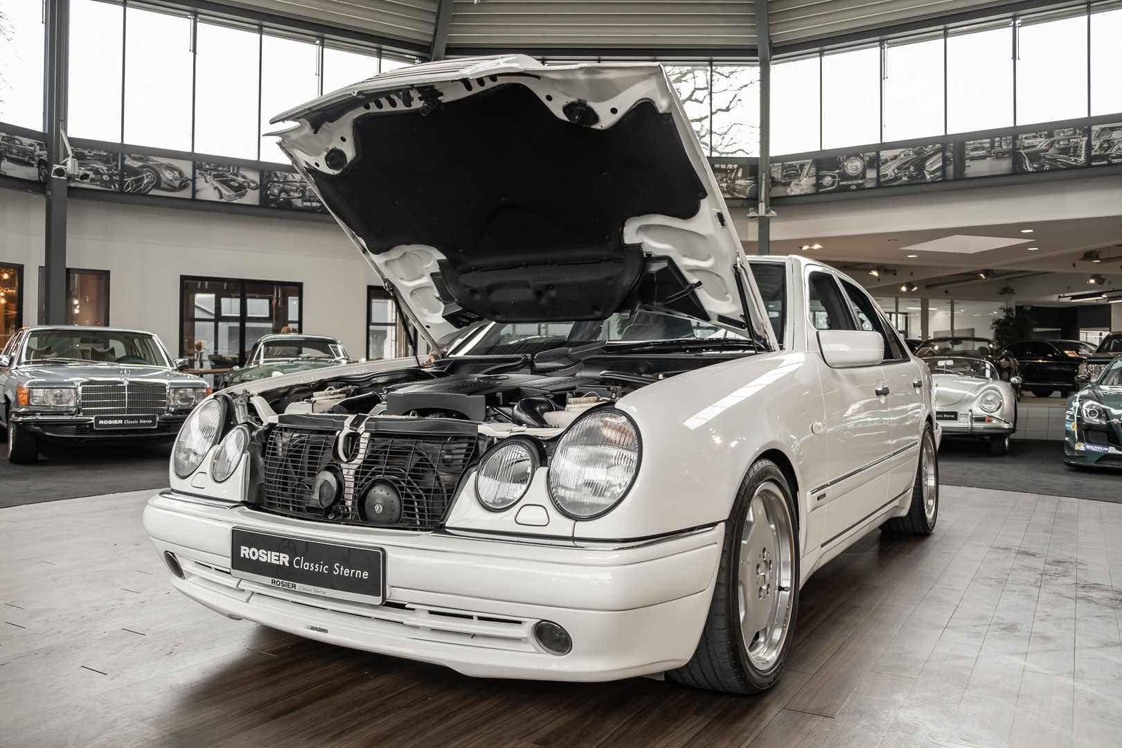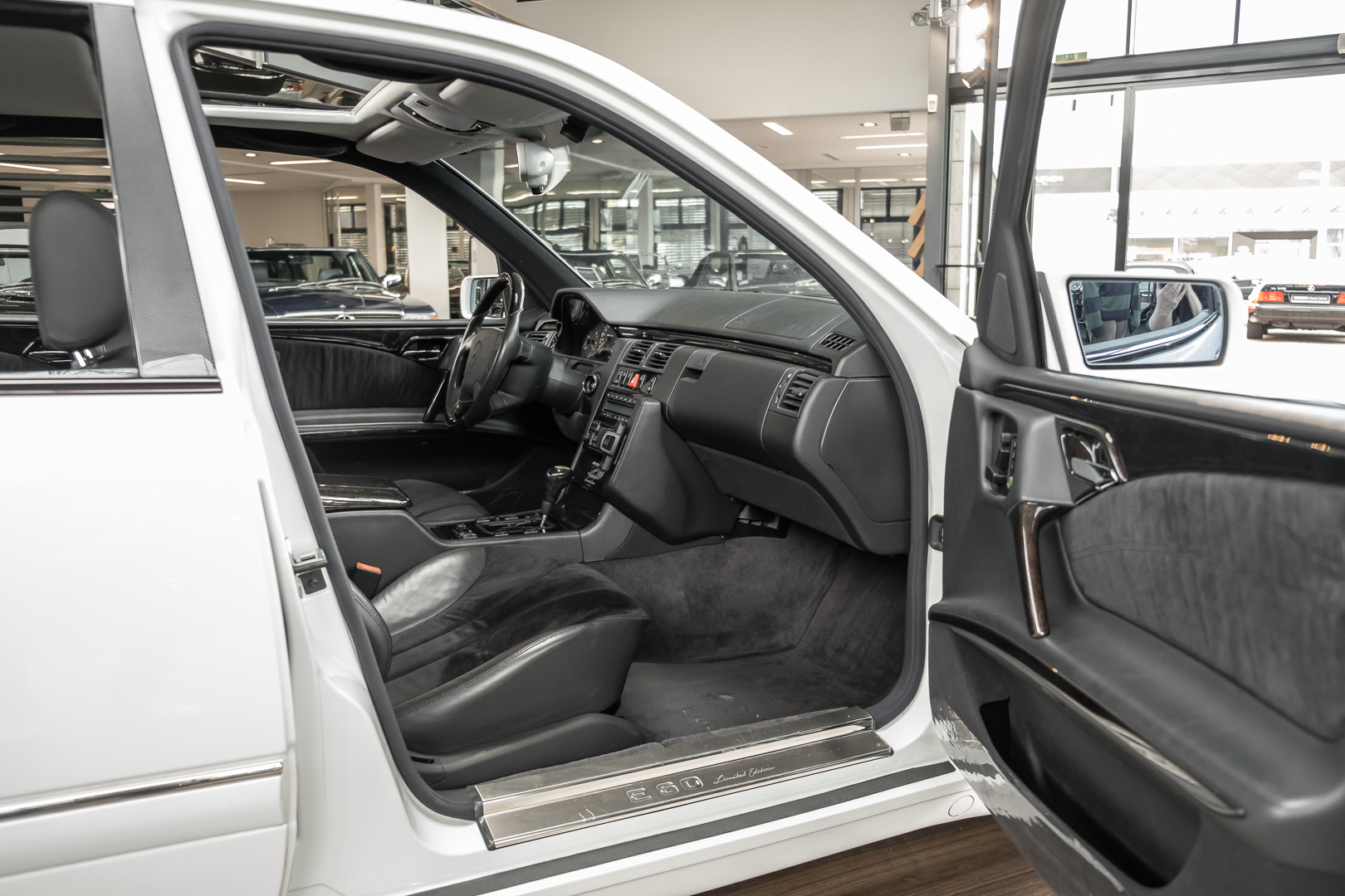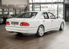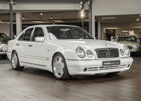 Wir freuen uns, Ihnen dieses 210er-Schmuckstück aus dem Hause AMG anbieten zu können. Zunächst verließ diese AMG-Rarität das Werk in Sindelfingen als E 50 AMG, der mit 347 PS bereits ausreichend Kraftreserven bereithielt. Bestimmt war die vollausgestattete Sport-Limousine in firnweiß für einen japanischen Kunden, der das Exklusive liebte. Genau das war der Grund, warum das Fahrzeug – vor der langen Reise nach Japan – erst noch nach Affalterbach gelang, wo die AMG-Experten auf die besondere Anfrage hin, den Umbau auf den leistungsgesteigerten E 60 AMG vornahmen. Der Umbau umfasste eine Leistungssteigerung durch AMG auf den hubraumvergrößerten Motor M 119-6.0 Kat, eine geänderte Achsübersetzung sowie angepasstes Getriebesteuergerät sowie ein AMG Holz-/Leder-Airbaglenkrad.
