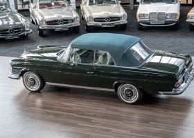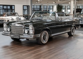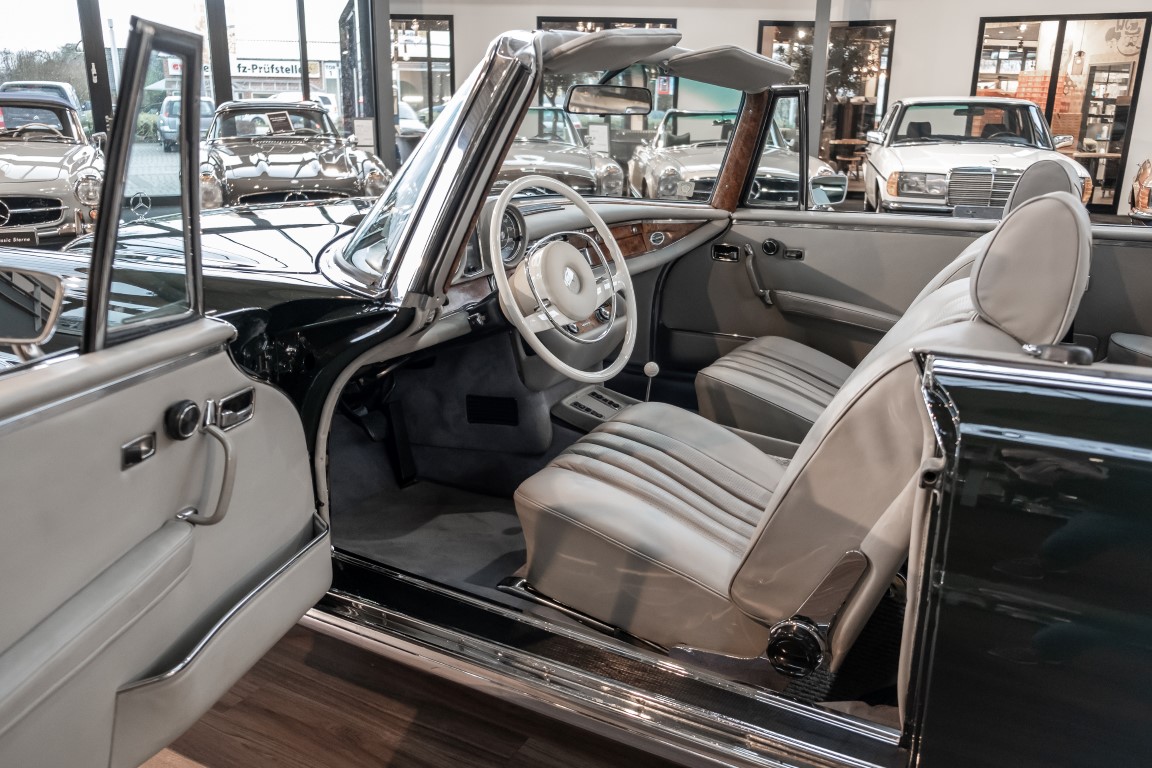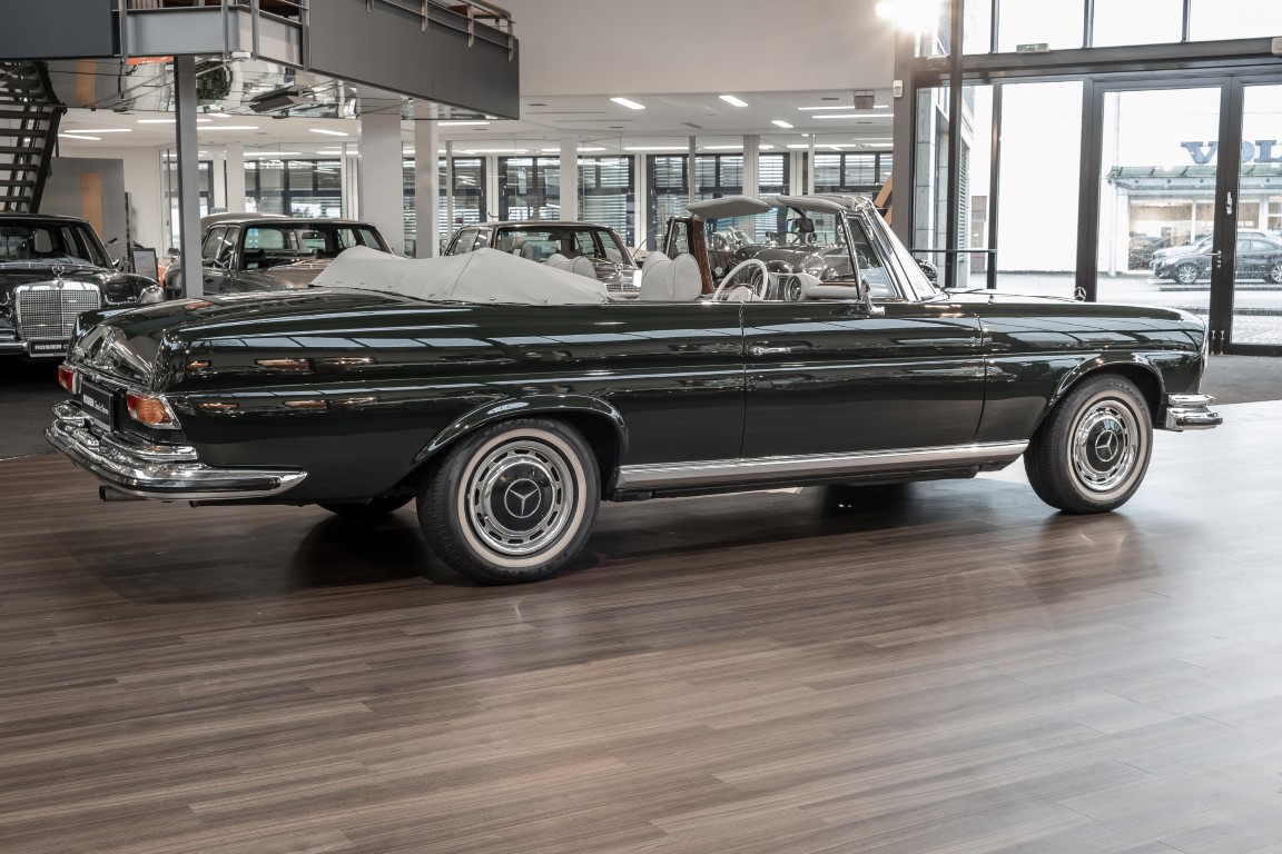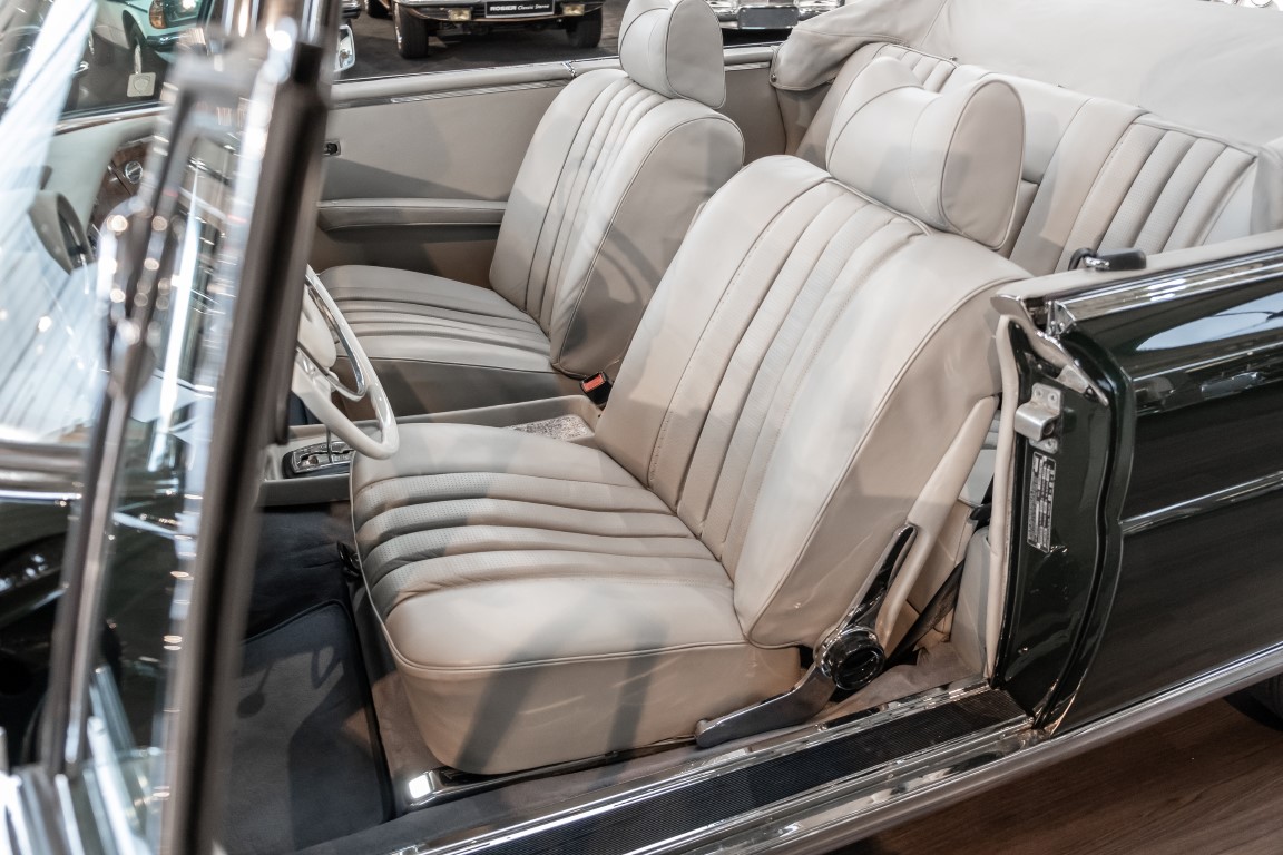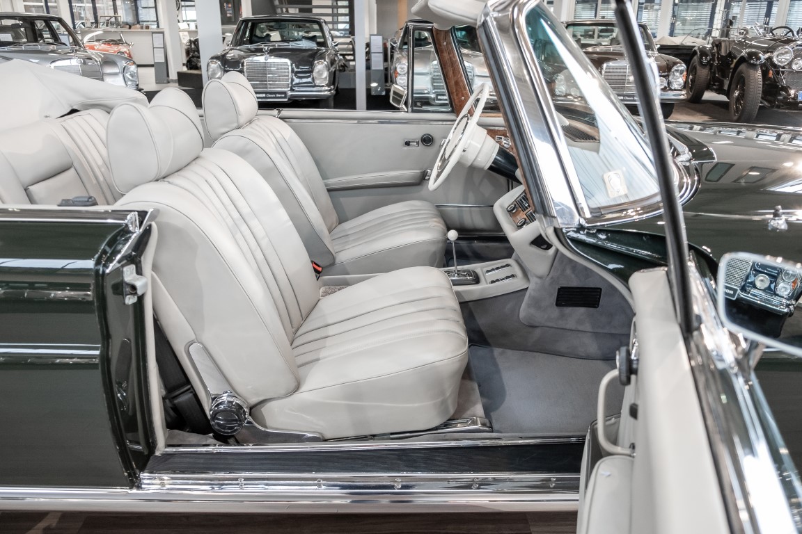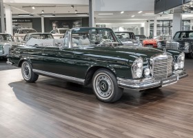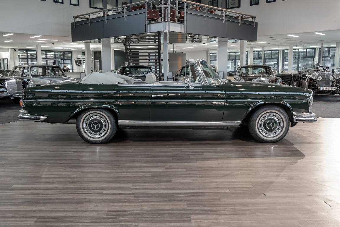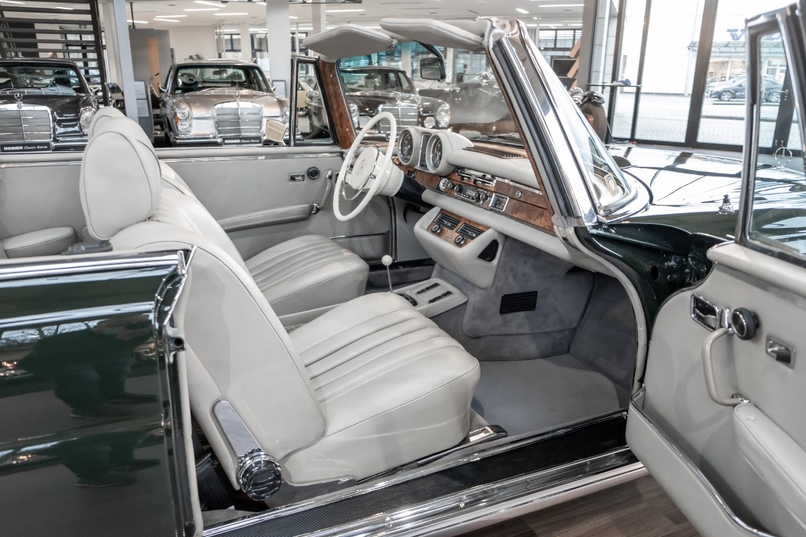 Ein S-Klasse Cabriolet aus dem Hause Mercedes-Benz gehört seit jeher zu den ganz besonders exklusiven Fahrzeugen in der ganzen Welt. Das hier angebotene Mercedes-Benz 280SE Cabriolet entstammt der so begehrten Flachkühler Serie von der nur etwa 1.390 Fahrzeuge gebaut wurden. Der Mercedes Händler aus Los Angeles in Kalifornien USA, hatte den Wagen geschmackvoll zusammengestellt und im Mercedes-Benz Werk bestellt. Schlichtweg eine Augenweide in elegantem Dunkelolivgrün und grauem Leder Interieur wurde geliefert. Ganz im Stil und Geschmack der vermögenden Käuferklientel. Schnell fand der Wagen einen Abnehmer, der mit ihm für die nächsten Jahre durch das sonnige Kalifornien cruiste. In 1989 kam er wohl in den Besitz von Elizabeth „Betsy“ Asher, einer Insiderin der Musikindustrie und Tochter aus gutem Hause. Sie arbeitete als Publizistin, war ein selbsternannter politischer Nachrichtenjunkie, widmete sich leidenschaftlich dem Tierschutz und kannte viele bestens bekannte Musiker und Songwriter der Rockmusik Szene. In 2013 kam das elegante Cabriolet nach Deutschland über ein Handelshaus für klassische Automobile in Rheinland-Pfalz in den Besitz eines Unternehmers aus Niedersachsen. In seinem Besitz wurde der Wagen liebevoll gepflegt und stets in bestem Zustand erhalten. Die letzten Arbeiten erfolgten in unserem Hause in 11.2020 und beinhalteten auch die umfangreiche Überholung des Automatikgetriebes. Nun soll der Wagen ein neues Zuhause bekommen. Eine tolle Chance auf eines der edlen Flachkühler Cabriolets zu interessantem Preis. Wir beraten Sie gerne.