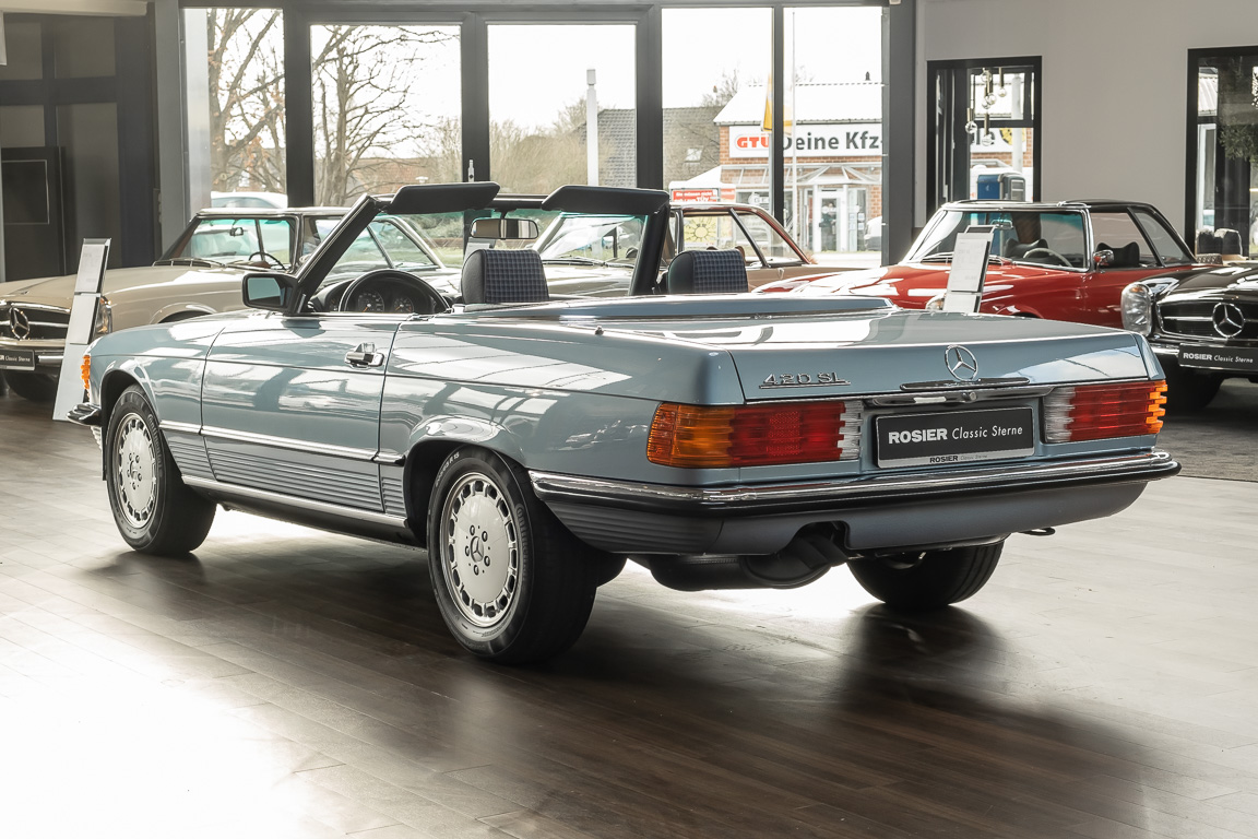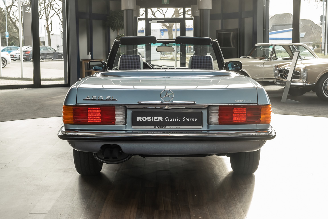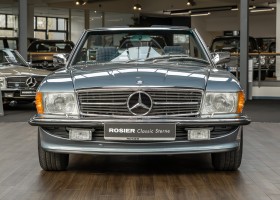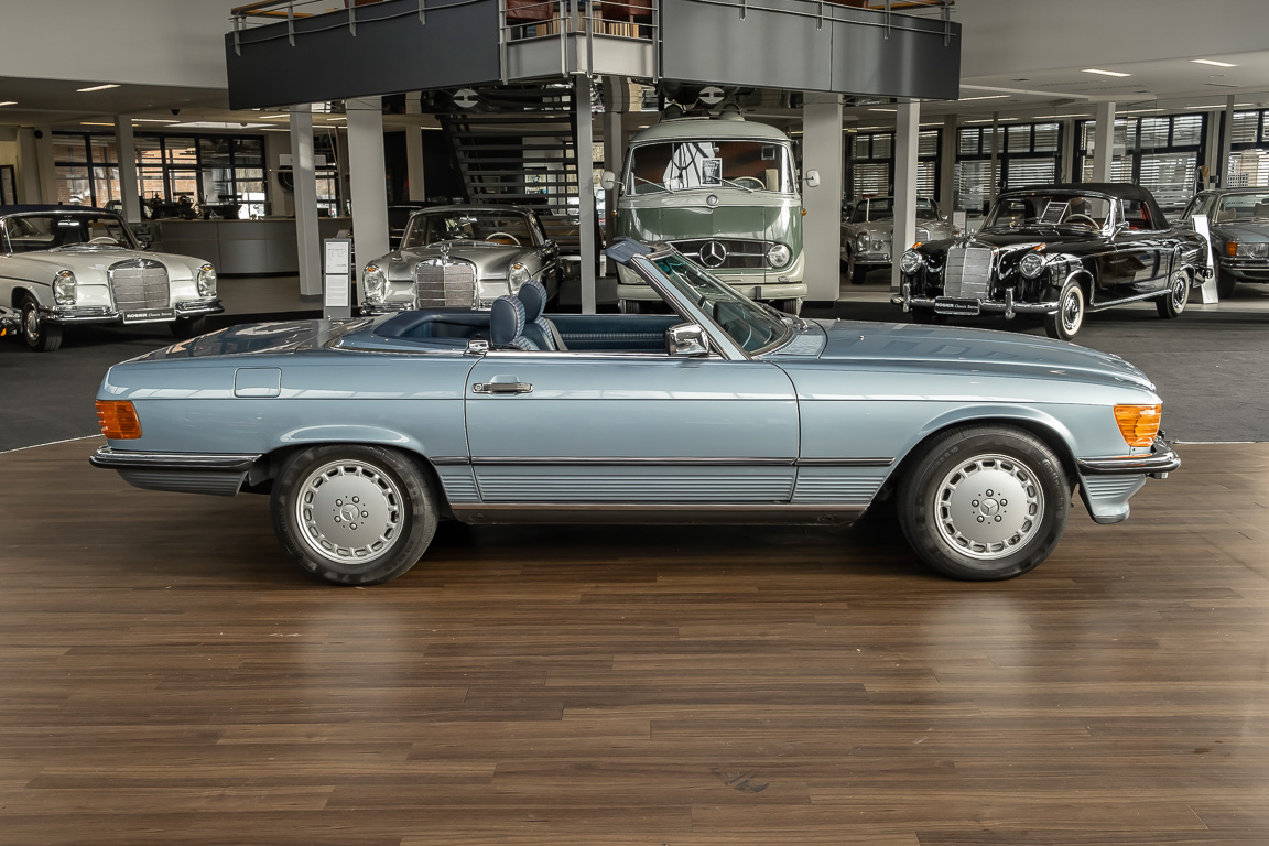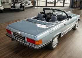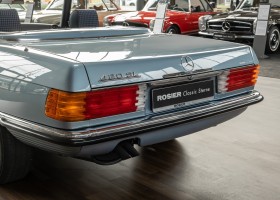 We are pleased to offer you this wonderful 420 SL of the 107 series. The charm of this dreamlike roadster in Diamond Blue Metallic is enormous and immediately enchants its environment. With a sensational mileage of just 14,700 km and an incredible state of care, the vehicle convinces not only visually but also technically on the whole line.