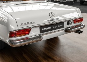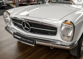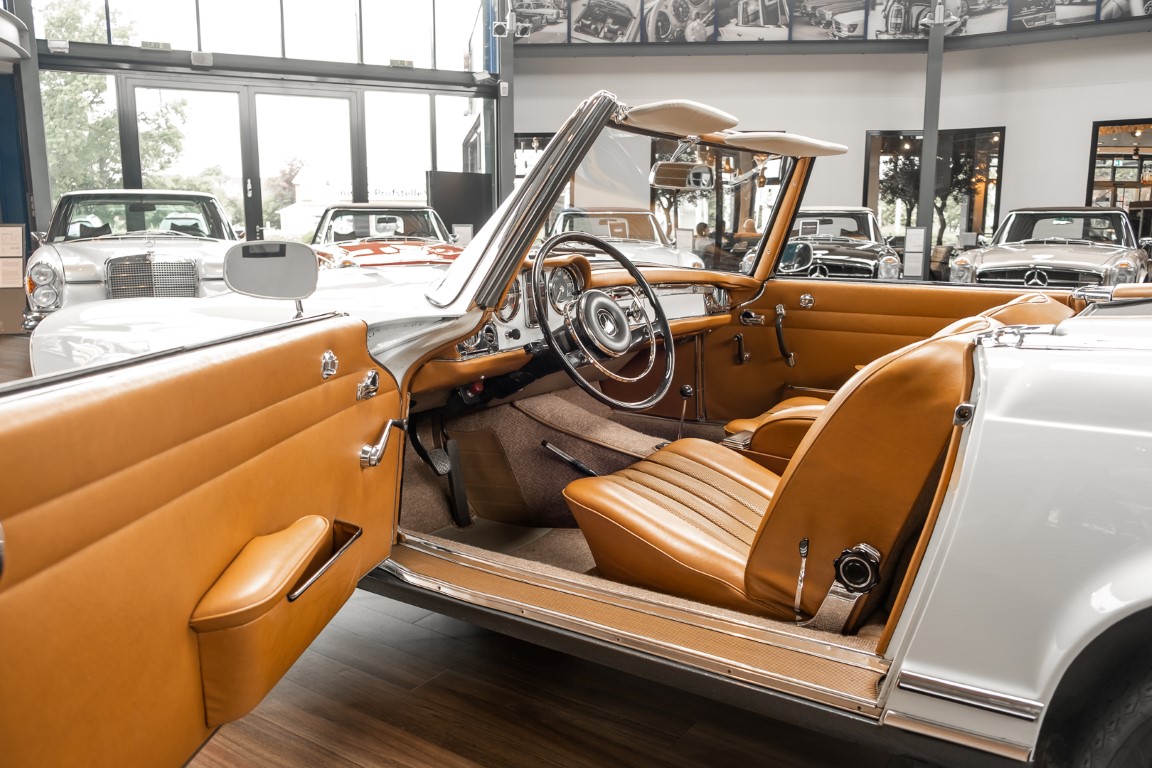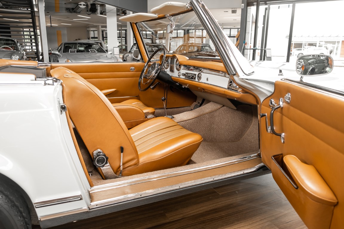Eine wahrhaft einzigartige 230 SL Pagode können wir Ihnen mit diesem Traumroadster in klassischem Papyrusweiss mit braunem Kunstleder anbieten. Nicht mehr oft wird man eine solch originale und toperhaltene Pagode finden. Dem originalen Kundendienstheft ist zu entnehmen, dass das Fahrzeug am 17.11.1966 an seinen Besitzer in die französische Metropole Paris, genauer gesagt in die Gemeinde Ivry-sur-Seine – etwa 7km südöstlich des Pariser Stadtzentrums, geliefert wurde. Den lückenlosen Einträgen zufolge verblieb das Fahrzeug bis 1978 in Paris. Einträge aus Nizza und Monaco zeugen von ausgiebigen Reisen an die malerische Côte d’Azur, in dessen Umgebung sich dieser Klassiker wohl bestens eingefunden hat.