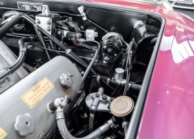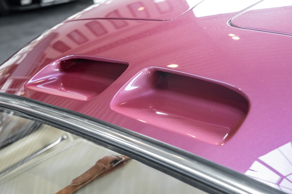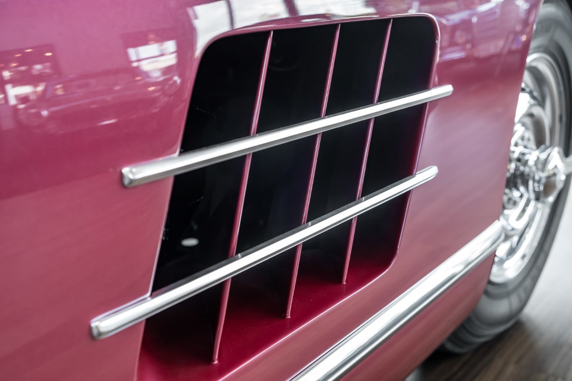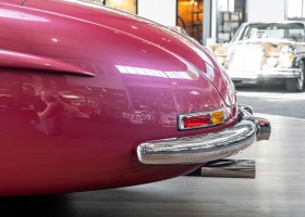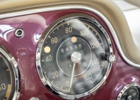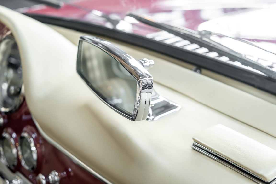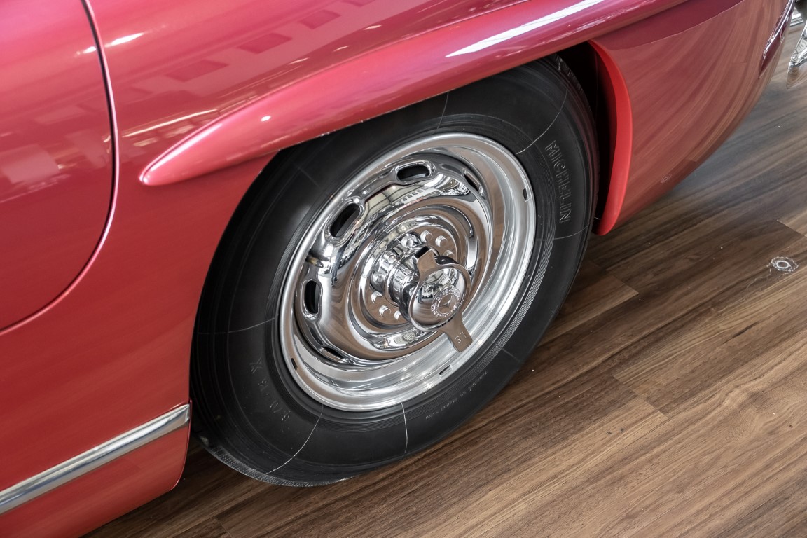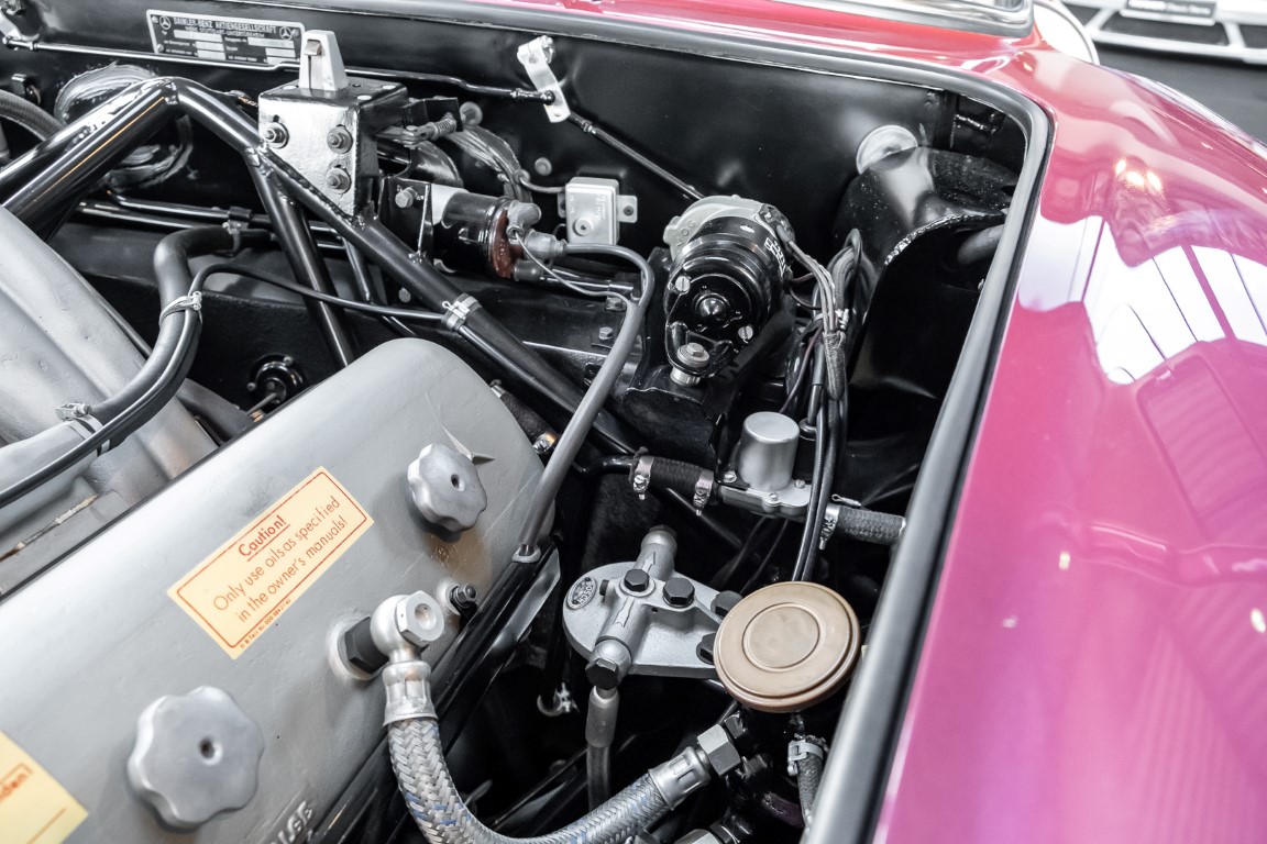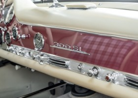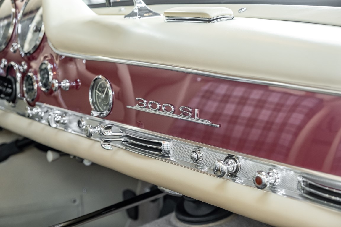 Laut dem Gullwing Group Registry war der erste Besitzer des Coupés Nr. 20 Roy Miller aus China Lake, USA. In den frühen 1970er Jahren wurde Weston Hook aus La Jolla, Kalifornien, Eigentümer, der den Wagen in den nächsten vier Jahrzehnten betreute und schließlich an seinen Sohn übergab. Weston Hook verbrachte seine Zeit sowohl in Kalifornien als auch auf Hawaii, wobei letzteres das Zentrum seiner Immobiliengeschäfte war, und so pendelte der Wagen zwischen den beiden sonnigen Orten am Pazifik. Nach mehreren Jahrzehnten des Besitzes und der Nutzung beauftragte Hook den wohl renommiertesten 300 SL-Restaurator Jerry Hjeltness aus Escondido, Kalifornien, mit einer Restaurierung, deren Ergebnis man kurz und knapp als außergewöhnlich bezeichnen kann. Im Laufe von zwei Jahren und mit viel Liebe zum Detail wurde der Flügel mit der Nr. 20 bis ins kleinste Detail komplett restauriert und in den zeitgemäßen Mercedes- Farben DB 543 Erdbeerrot Metallic lackiert. Die Kombination mit beigefarbener Lederausstattung und grün karierten Sitzen ist stilsicher und außergewöhnlich. Passendes Gepäck und verchromte Rudge-Räder vervollständigen das unbestreitbar schöne Erscheinungsbild, das in jeder Gesellschaft die Aufmerksamkeit auf sich zieht. Das Ergebnis dieser Restaurierung hat unweigerlich zu vielen Concours-Siegen in der Klasse und in ganzen Ausstellungsbereichen geführt. Das Auto ist einfach eine „Best-of-the-Best“-Restaurierung, von einem der besten 300SL-Restauratoren.