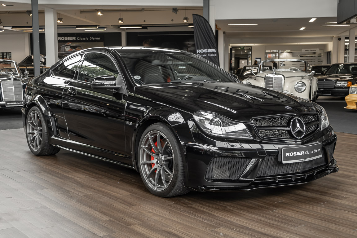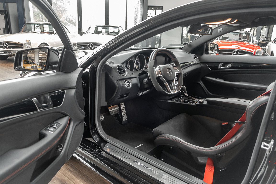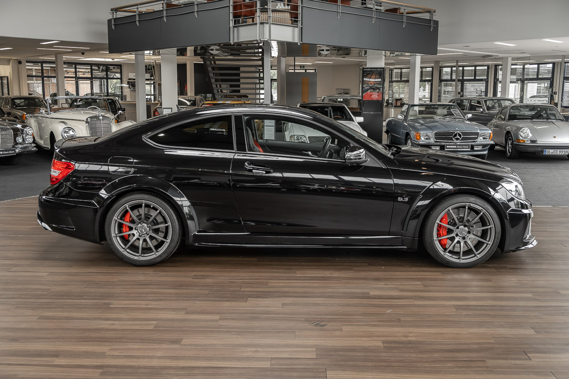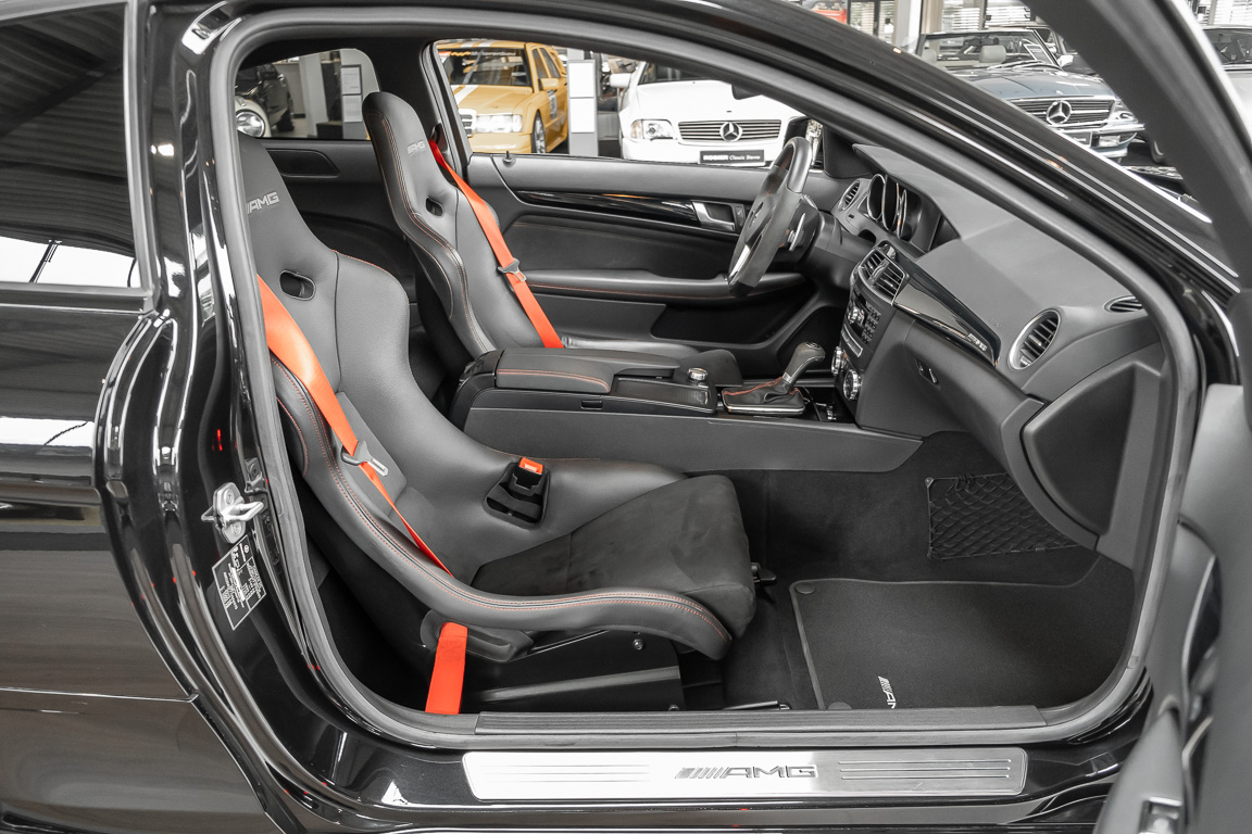 Wir freuen uns, Ihnen dieses C 63 AMG Coupé in der seltenen Black Series Ausführung anbieten zu dürfen. Als höchste Ausbaustufe der Baureihe 204 schöpft der Black Series 517 PS aus 6,3 Liter Hubraum – nur etwa 800 Enthusiasten kamen damals in den Genuss dieses Ausnahmesportlers. Insgesamt nur drei Vorbesitzer durften sich dem Genuss dieses V8 hingeben. Die Emotionen, die dieser letzte echte AMG Sauger weckt, sind nur schwer in Worte zu fassen. Die Lackierung in Obsidian Schwarz Metallic in Kombination schwarzem Alcantara und roter Ziernaht steht diesem Black Series wie ein Maßanzug. Das Fahrzeug ist komplett gewartet und wird mit frischer HU/AU an seinen neuen Besitzer übergeben. Nutzen Sie diese besondere Gelegenheit und erfahren Sie den Mythos dieses Black Series.