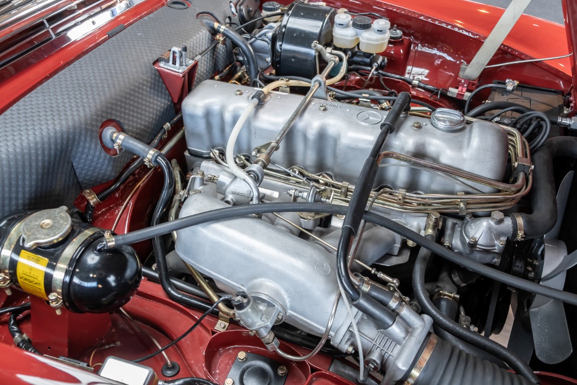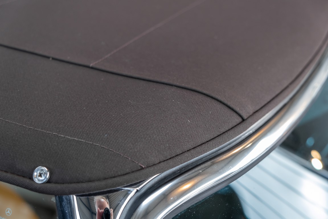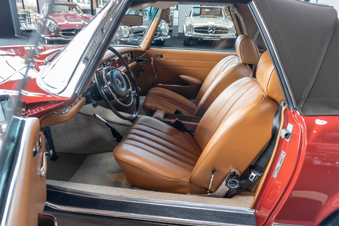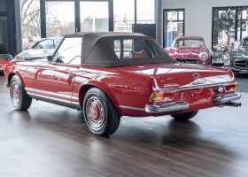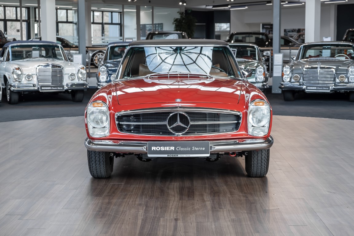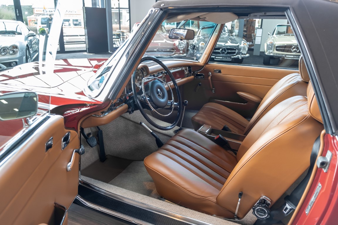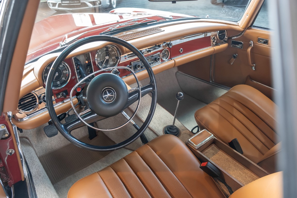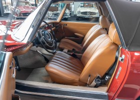 An interesting Pagoda with a comprehensible history, which would have been immediately ready for extended trips. Our plans for the vehicle, however, were different. Under our direction, the car underwent an extensive restoration. The task was to achieve a quality restoration at the highest level of craftsmanship. See for yourself, the goal was excellently achieved. The body has been extensively reworked and repainted, axles and transmission have been overhauled, the engine has been tested and fine-tuned after passing the pressure loss test. Powerful running and a clean compression pattern underline the result. To upgrade the interior and give the overall look the final touch, we decided to upgrade the interior with fine leather in cognac instead of the original MB-Tex. A soft top in dark brown makes this Pagoda a real eye-catcher. All in all a special Pagoda, which knows how to convince with its unique charm and inspires with manual transmission. Get in and experience this dream pagoda with all your senses.