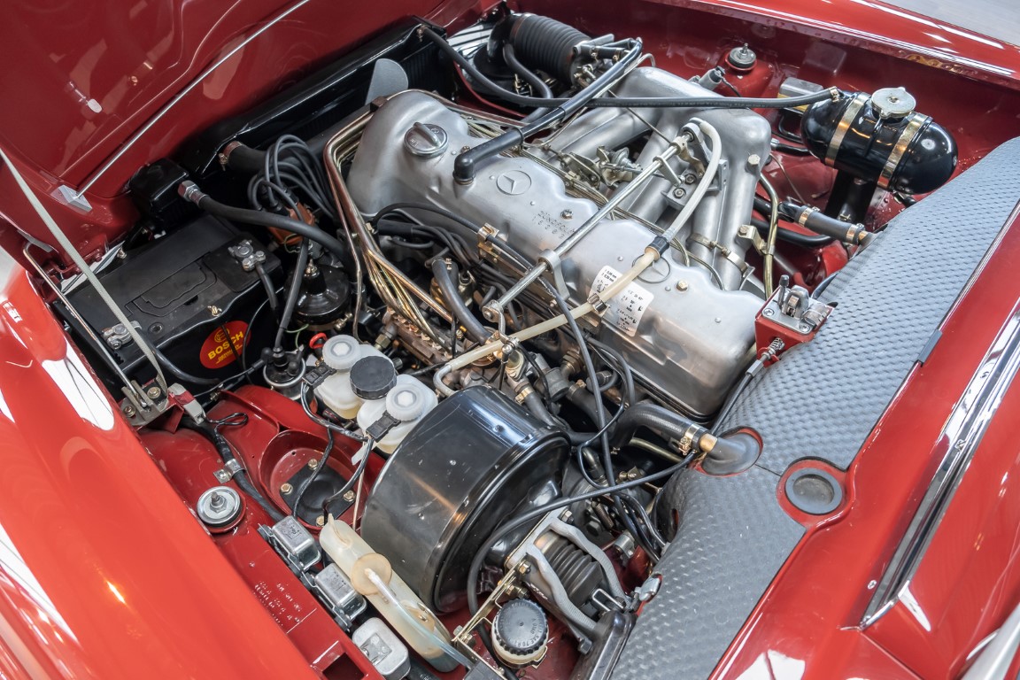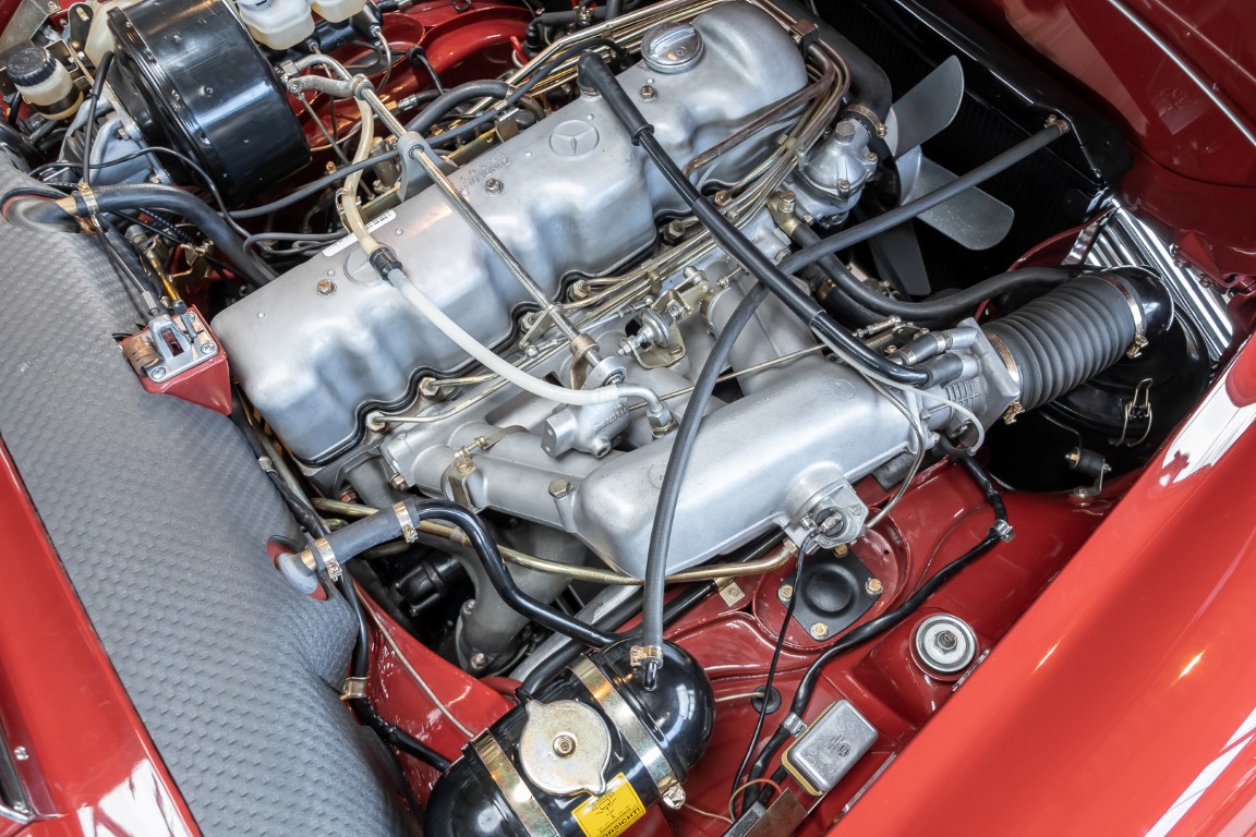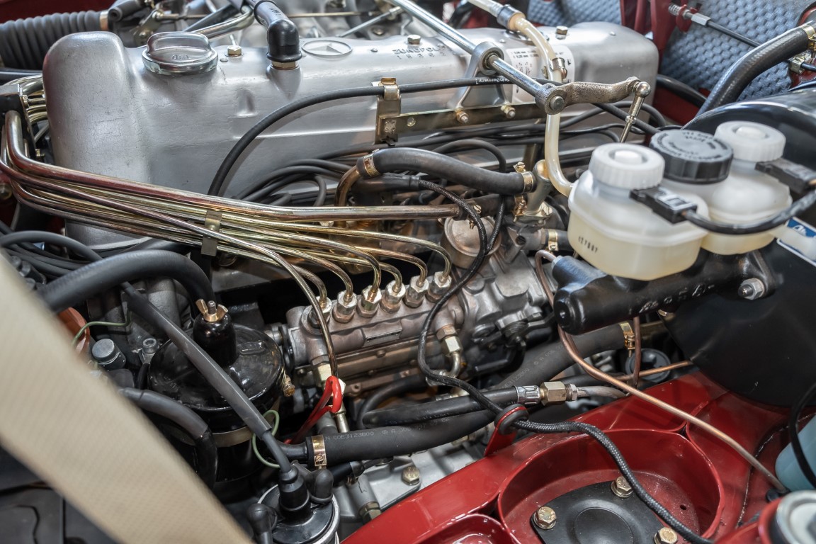 This Mercedes Benz 280SL Pagoda delivered in attractive (576G) red was delivered according to our records on August 23, 1968 to its first owner, a member of the US Navy in the USA. The car was equipped with a 4 speed manual transmission, black MB Tex, Becker radio and a hardtop painted in the color of the car. The first owner kept the car until 1972 and the new owner took great pleasure in the sensational roadster and kept the car for a total of 22 years before giving it to his niece in Massachusetts in 1994. She had a teaching job at the university and lived within walking distance. So over the next 17 years, the car was driven just 829 miles. In 2011, the 3rd owner to date sold the car. In 2014, the Pagoda was relinquished again and finally came into our possession in Germany in the spring of 2016.